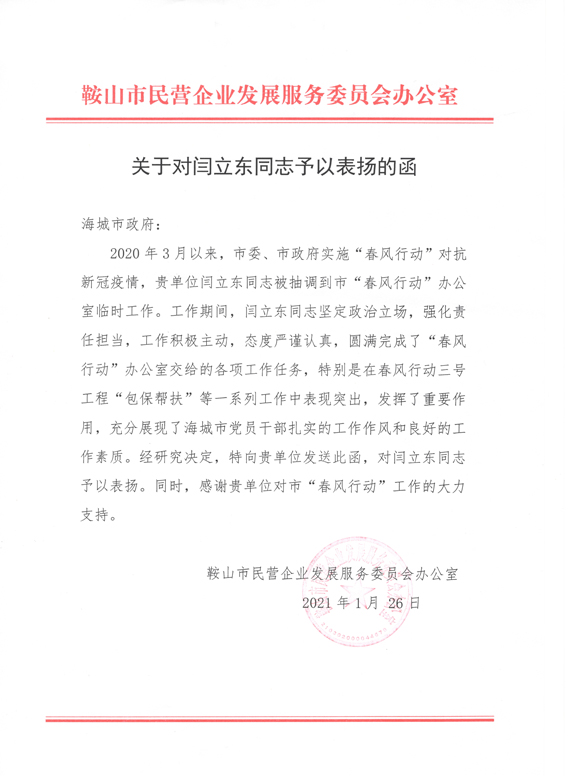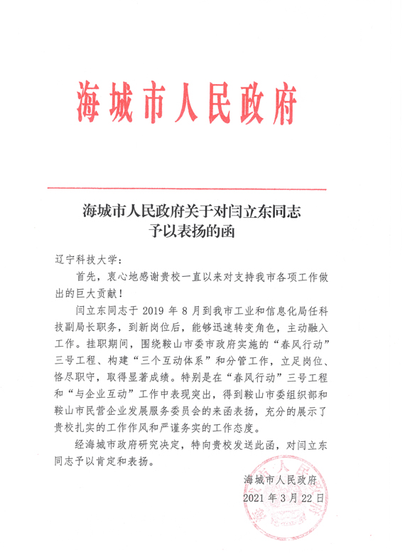 2021年1月,鞍山市民营企业发展服务委员会办公室向海城市政府送发了《关于对闫立东同志予以表扬的函》;2021年3月,海城市人民城府向九游在线官网_九游(中国)送发了《海城市人民政府关于对闫立东同志予以表扬的函》,对闫立东同志坚定政治立场、强化责任担当,积极主动完成鞍山市的各项重点工作任务予以表扬;对科大教职工在各项工作中表现出的扎实工作作风和严谨务实的工作态度予以肯定。校党委对闫立东同志能够站在学校与地方共谋振兴发展大局的高度,敢于担当,勇于奉献,积极作为,取得了较好的工作成绩表示肯定,并号召广大选派干部向闫立东同志学习,提高站位、增强意识、珍惜机会、主动作为,在推动辽宁全面振兴、全方位振兴的广阔天地里锻炼成长。