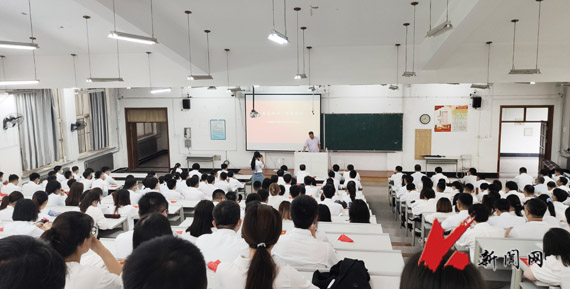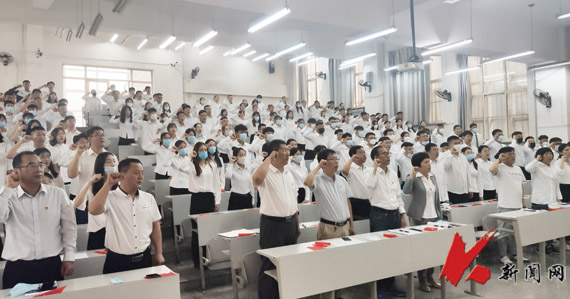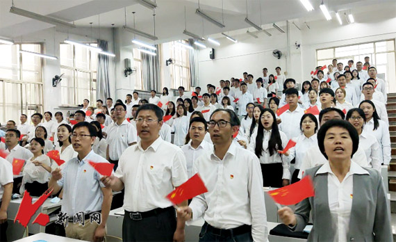 报告开始前,与会师生党员手持国旗,齐声合唱《没有共产党就没有新中国》;最后,大家高举右手,庄严地重温了入党誓词,宣誓声响彻教学楼、久久回荡。(土木学院 曹桐赫/文 田欣瑶/摄)