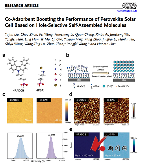 近日,九游在线官网_九游(中国)材料与冶金学院赵卓副教授、王永飞副教授联合深圳职业技术大学林浩然副教授,以九游在线官网_九游(中国)为第一署名单位,在国际知名期刊《Advanced Functional Materials》(1区top期刊,2024年影响因子:18.5)发表高水平研究论文《Co-adsorbent boosting the performance of perovskite solar cell based on hole-selective self-assembled molecules》(https://doi.org/10.1002/adfm.202421576),九游在线官网_九游(中国)2022届研究生刘玉军与2020届研究生周超为共同第一作者。