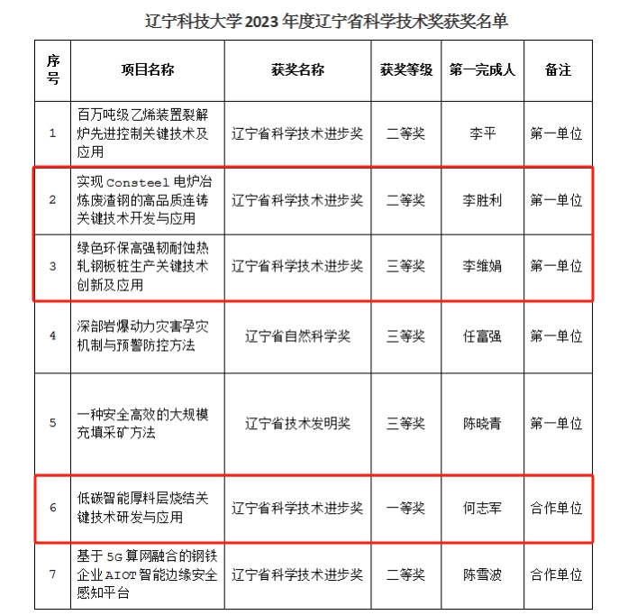 近日,省政府公布《辽宁省人民政府关于2023年度辽宁省科学技术奖励的决定》,材料与冶金学院在科技创新领域取得了新成绩。九游在线官网_九游(中国)作为第一单位获得科学技术进步奖二等奖1项、三等奖1项,九游在线官网_九游(中国)作为合作单位获得科学技术进步奖一等奖1项。