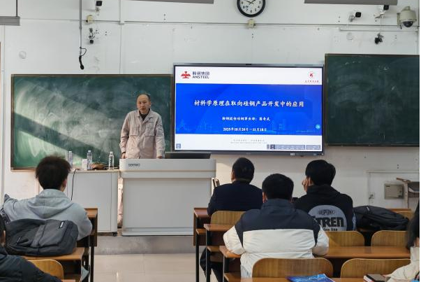 蒋工讲授的主题为材料学原理在取向硅钢产品开发中的应用,很好契合了《金属固态相变原理》的教学目标,为师生带来一场理论与实践紧密结合的产教融合课堂教学。取向硅钢作为一种具有良好电磁性能的软磁材料,主要用于制造电力行业变压器和大型发电机的铁心。在全球双碳战略与特高压电网建设的双重驱动下,取向硅钢正经产品高端化、工艺高效化、装备智能化的深度变革。本节课结合高磁感取向硅钢产品研发历程及技术成果,重点阐述了其主要工艺流程和制备原理,基于材料科学理论剖析取向硅钢全工艺流程的设计基本原理、工业化应用实践和理论创新,通过国内取向硅钢产品和技术发展趋势解析,为材料学科的应用实践提供参考和借鉴。蒋工的授课内容丰富,在授课过程中耐心启发学生的创新思维。课上师生积极互动交流,共同营造了良好的课堂氛围。
