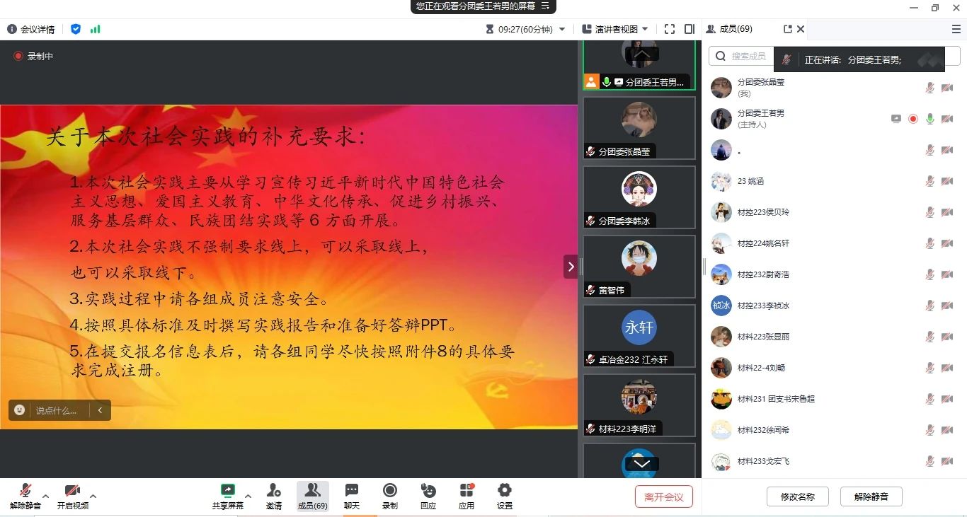7月11日,材冶学院在腾讯会议召开了暑假“三下乡”社会实践活动动员大会,会议由社会实践部门工作人员主持,共计超过60名同学参与本次会议。