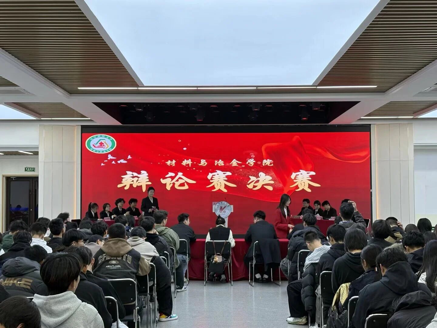 本届辩论赛共有16支队伍参赛,经过12场比赛的激烈比拼,最终4支队伍晋级决赛。决赛现场,材冶学院团委书记徐跃鸣、学生会执行主席郭昱闻、辩论队队长李培宁等嘉宾出席本次决赛