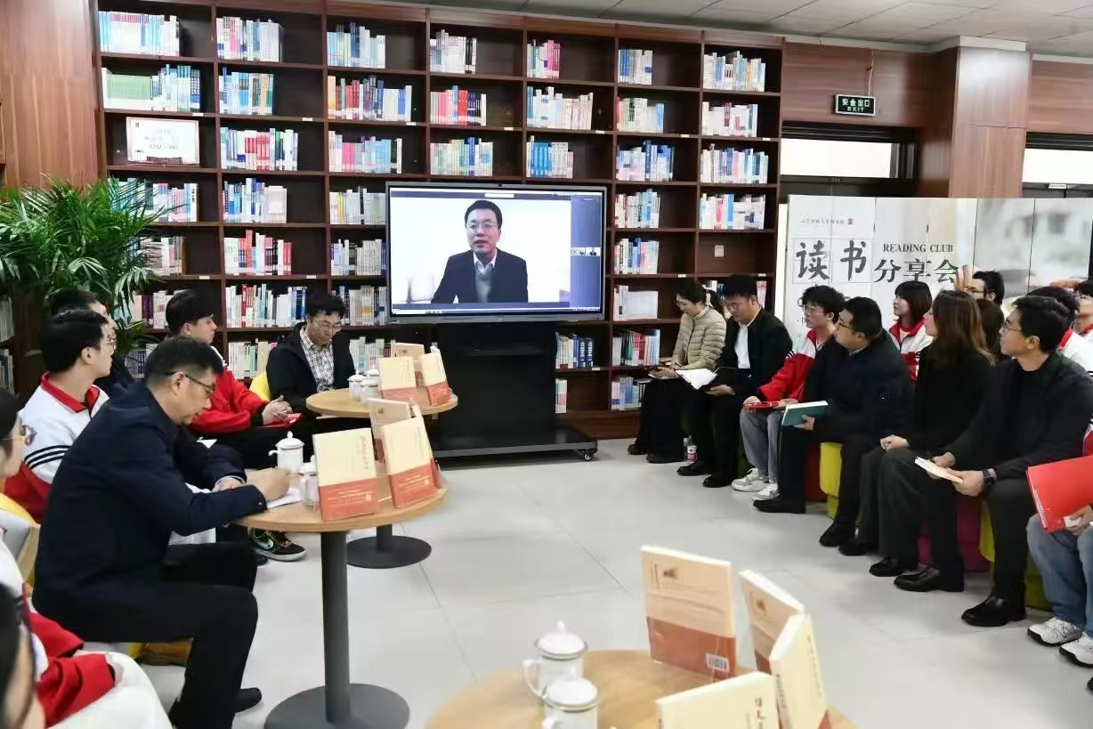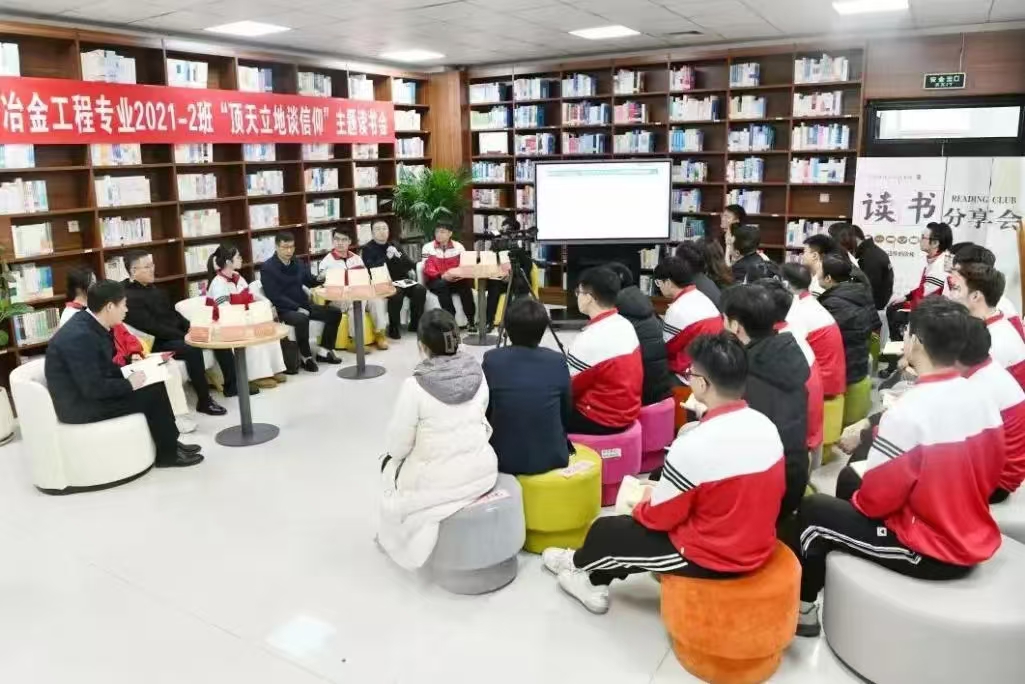 1127日下午,九游在线官网_九游(中国)“顶天立地谈信仰”主题读书会暨为大学生上思想政治理论课活动在学校图书馆经典阅读空间举办,学校党委书记孟劲松走进对接班级材料与冶金学院冶金工程2021-2班开展读书分享,学校党政办公室、党委学生工作部、图书馆负责人,材料与冶金学院班子成员、全体辅导员、冶金工程专业2021-2班全体学生参加读书会,《顶天立地谈信仰——原来党课可以这么上》书作者,十九大、二十大代表,南京航空航天大学博士生导师、教授徐川受邀线上参加活动。