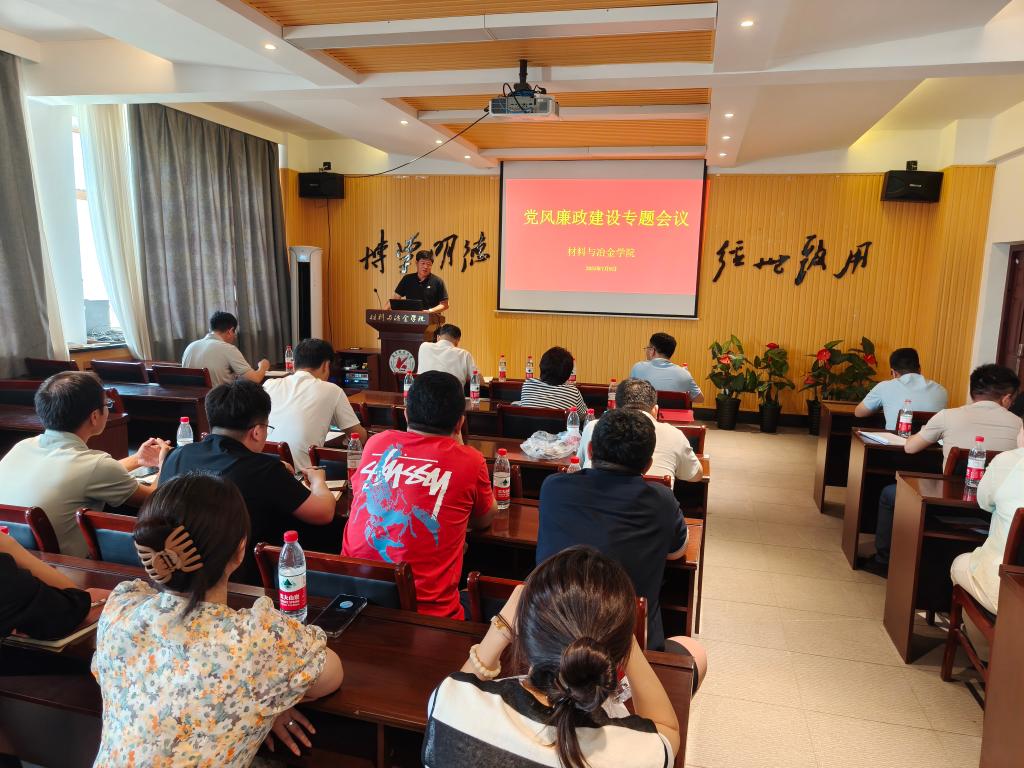会议伊始,艾英华组织学习《材料与冶金学院党风廉政建设责任制度》等多项制度文件,传达学校党风廉政建设会议精神及违纪违法典型案例通报。随后,纪委委员贾学龙领学相关工作办法与方案精神,并通报违反中央八项规定精神典型案例;纪委委员高守祺领学高校教师师德失范行为处理相关文件。期间,学院中层干部签订党风廉政建设承诺书。党委书记刘彦国介绍学院班子贯彻中央八项规定精神学习教育查摆问题情况,通报2025年学院廉政风险点排查情况并作总结讲话。会议最后,全体参会 人员共同观看警示片《监守自盗必自毁》。