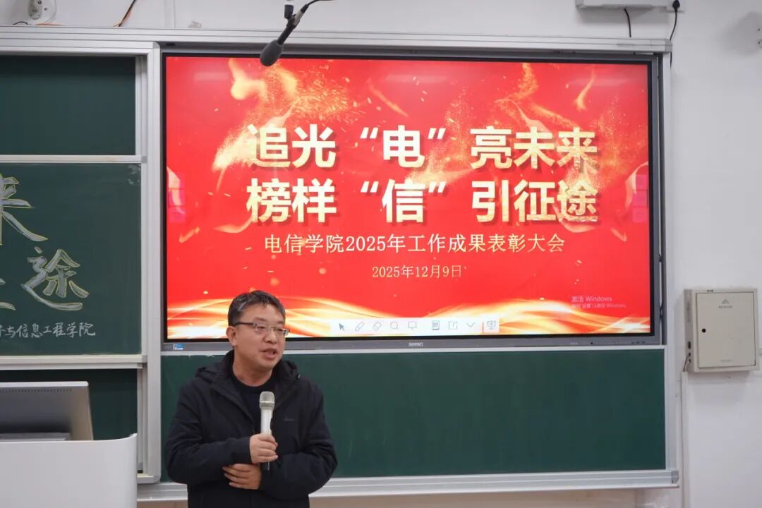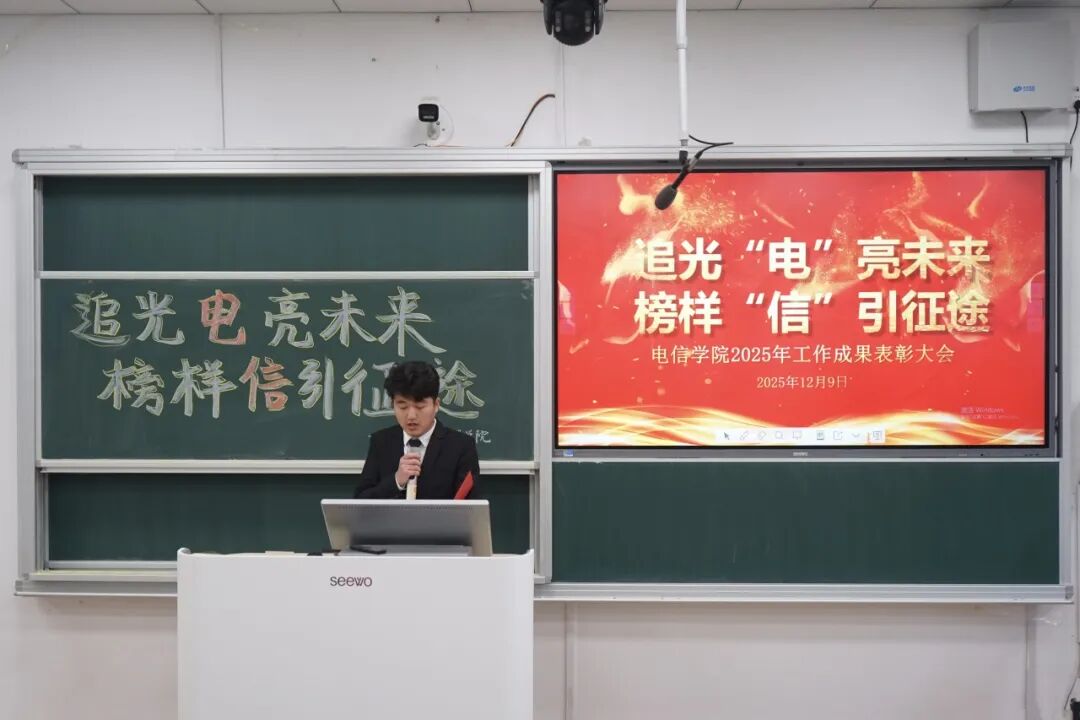 为进一步筑牢学风建设根基,发挥先进典型的示范引领作用,12月9日,电信学院工作成果颁奖典礼在博闻楼一合圆满举办。本次颁奖典礼由电信学院研究生会成员付金尉主持,学院党委书记王会立、副院长曲强担任颁奖嘉宾,学办老师施春妮,以及2024级、2025级研究生代表共同参加。