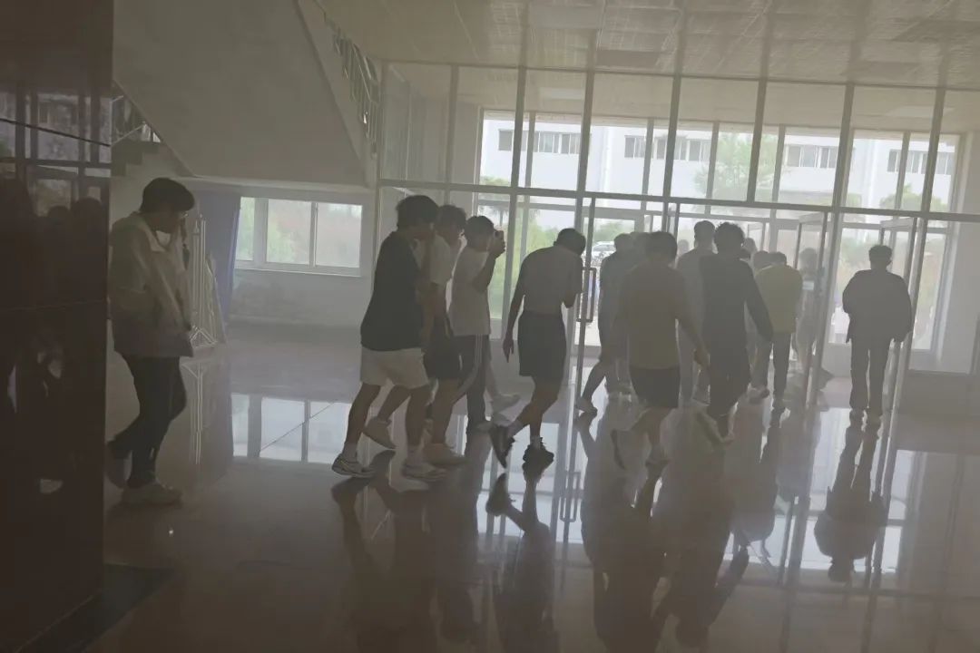 随着急促的警报声响起,演练正式启动。师生们用湿毛巾、衣物等捂住口鼻,沿预定路线弯腰低姿疏散,在各楼层引导员的指挥下,快速有序撤离至安全区域,展现出良好的应急素养。