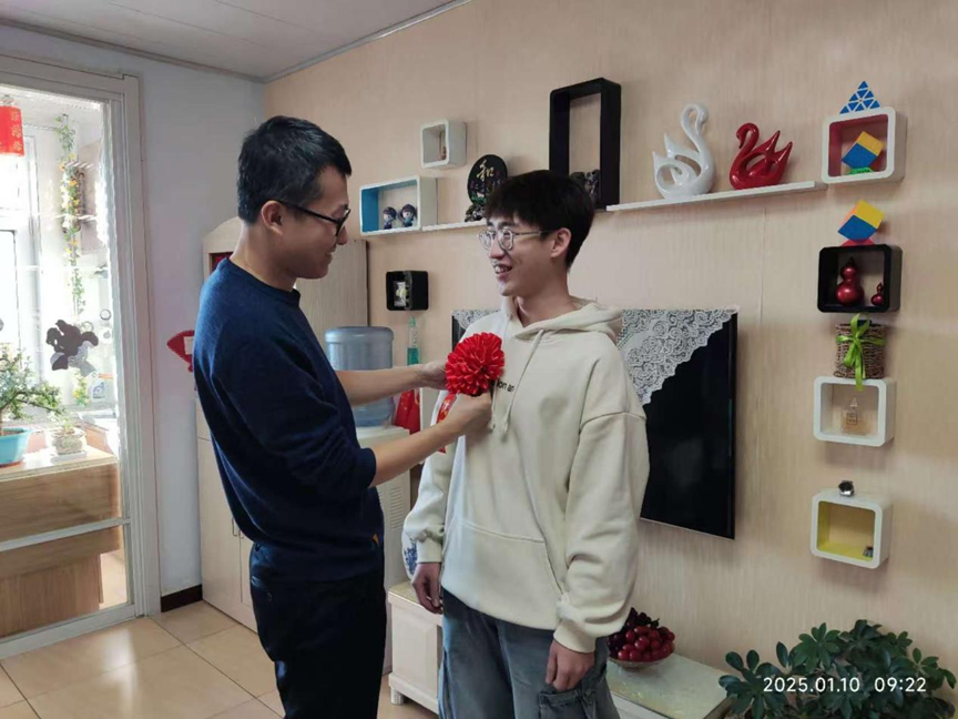 于家鹏还走访了家住朝阳地区的自动化专业23级的刘福庆、陈浩楠、周铭丰三位同学,为他们送去了喜报和大红花。2024年,刘福庆在“西门子杯”中国智能制造挑战赛中获得省特等奖,并获得校优秀学生三等奖学金;周铭丰在学校大学生通讯社获得优秀学生通讯员荣誉称号,并获得校优秀学生三等奖学金;陈浩楠担任班级班长,工作认真负责,获得学生工作骨干奖学金。