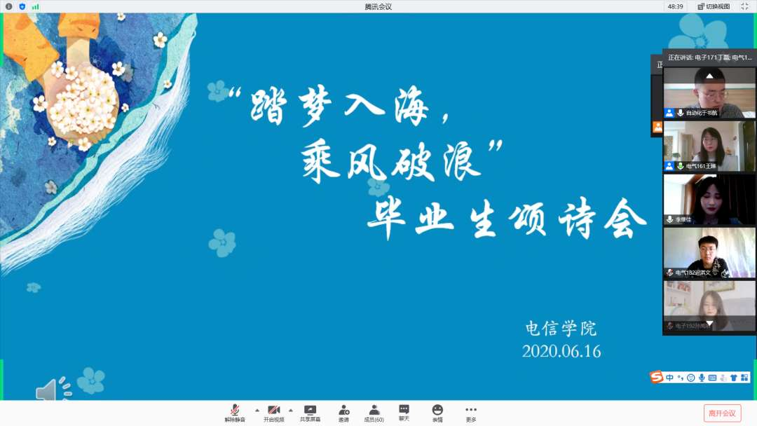 6月16日下午,电信学院举办“踏梦入海,乘风破浪”线上毕业生诵诗会。活动由学生干部陈晓航 、朱泓源主持,学院学生工作办公室老师出席,毕业班学生代表参加。