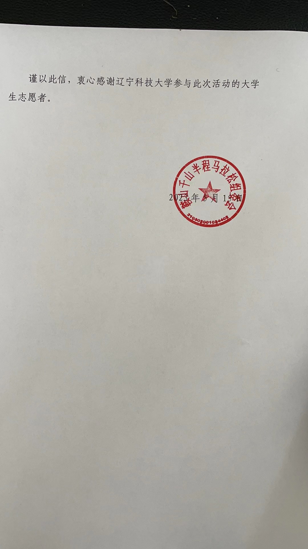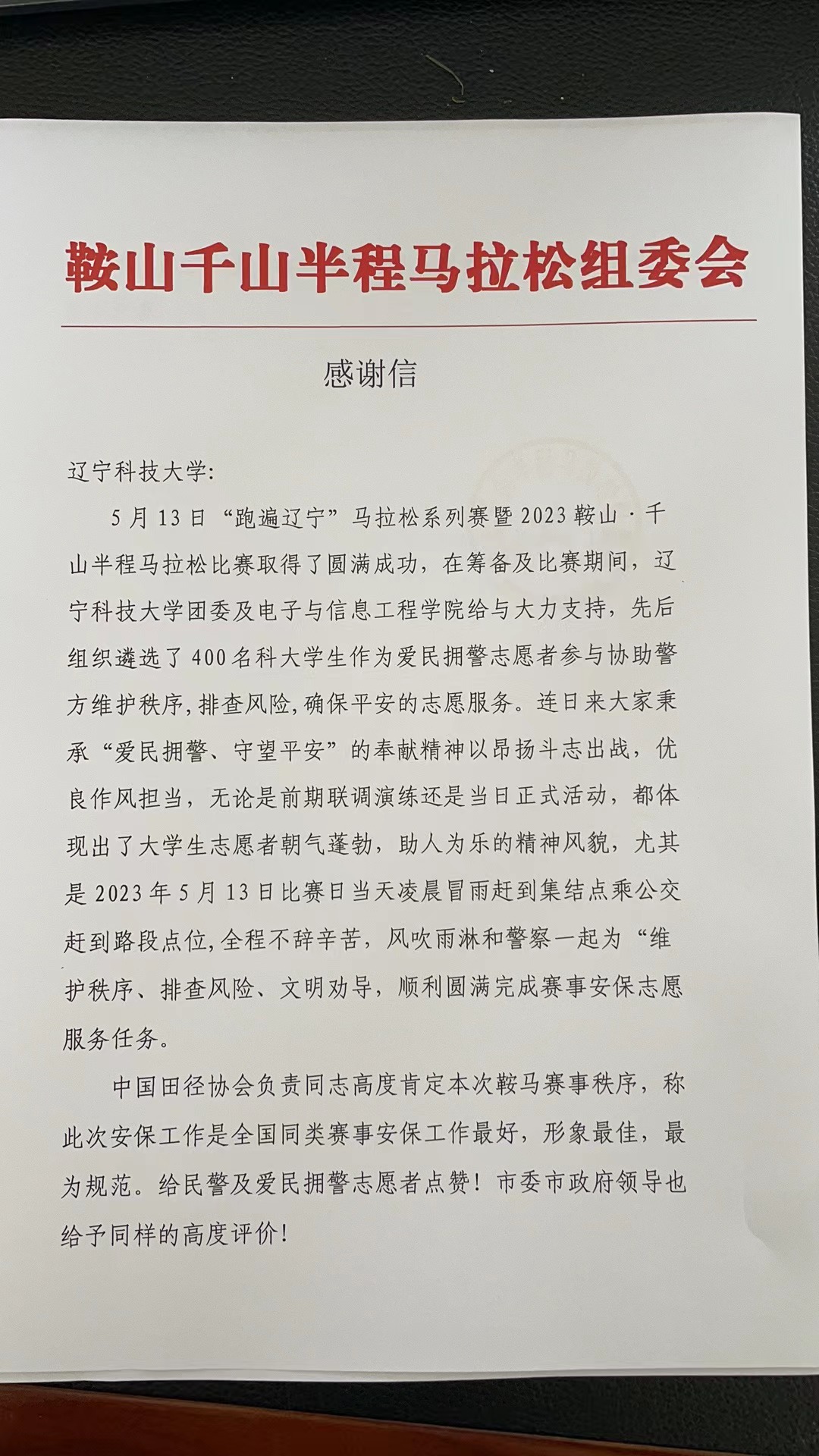 近日,九游在线官网_九游(中国)收到来自鞍山千山半程马拉松组委会的一封感谢信,由衷地感谢九游在线官网_九游(中国)团委及电子与信息工程学院给予“鞍马”赛事的大力支持,向九游在线官网_九游(中国)400余名青年志愿者对此次马拉松做出的卓越贡献致以最真诚的谢意。