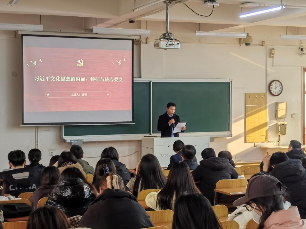 12月5日下午,管理学院、继续教育学院、科技园于博学楼C408教室联合开展学习贯彻习近平文化思想宣讲报告会。会议由管理学院党委书记董文武主持,三个部门的师生代表参加。宣讲会邀请学校理论宣讲团成员、校团委书记禹哲作题为《习近平文化思想的内涵、特征与核心要义》的专题宣讲。