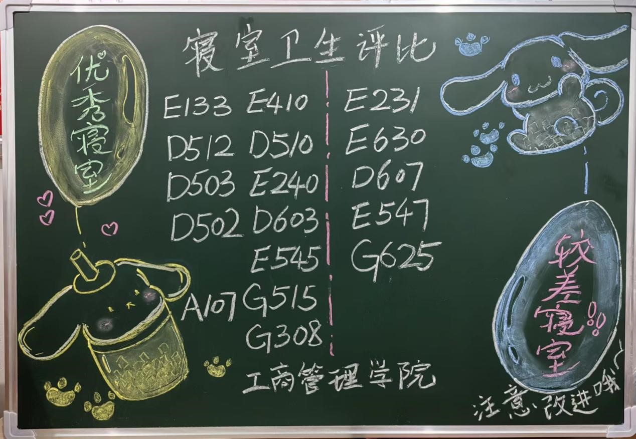 每周中午12:30,工商管理学院对全体本科生宿舍进行检查。在检查过程中发现大多数宿舍能够保持整体干净整洁,不乱扔垃圾,桌面摆放整齐,对这些优秀宿舍给予表扬。也有一些寝室内务卫生方面有待加强。现将检查结果公示如下: