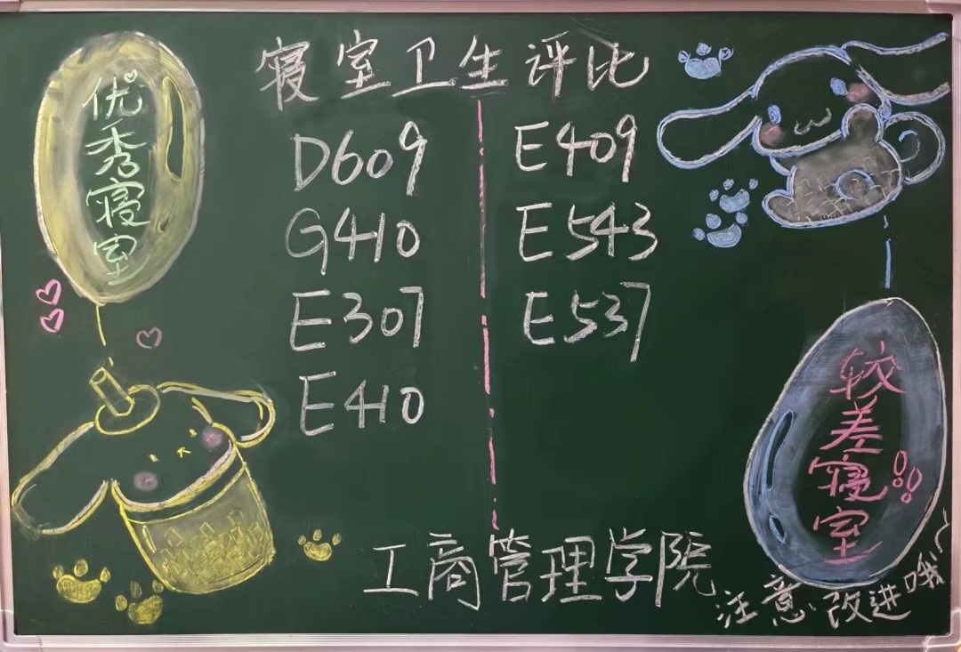 每周中午12:30,工商管理学院对全体本科生宿舍进行检查。在检查过程中发现大多数宿舍能够保持整体干净整洁,不乱扔垃圾,桌面摆放整齐,对这些优秀宿舍给予表扬。也有一些寝室内务卫生方面有待加强。现将检查结果公示如下:
