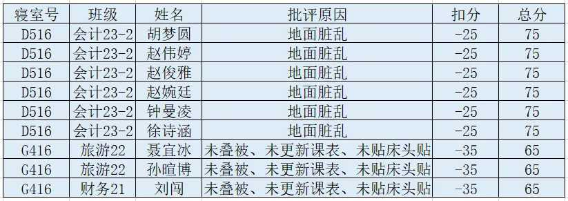 每天上午,工商管理学院对全体本科生宿舍进行检查。在检查过程中发现大多数宿舍能够保持整体干净整洁,不乱扔垃圾,桌面摆放整齐,对这些优秀宿舍给予表扬。也有一些寝室内务卫生方面有待加强。现将检查结果公示如下: