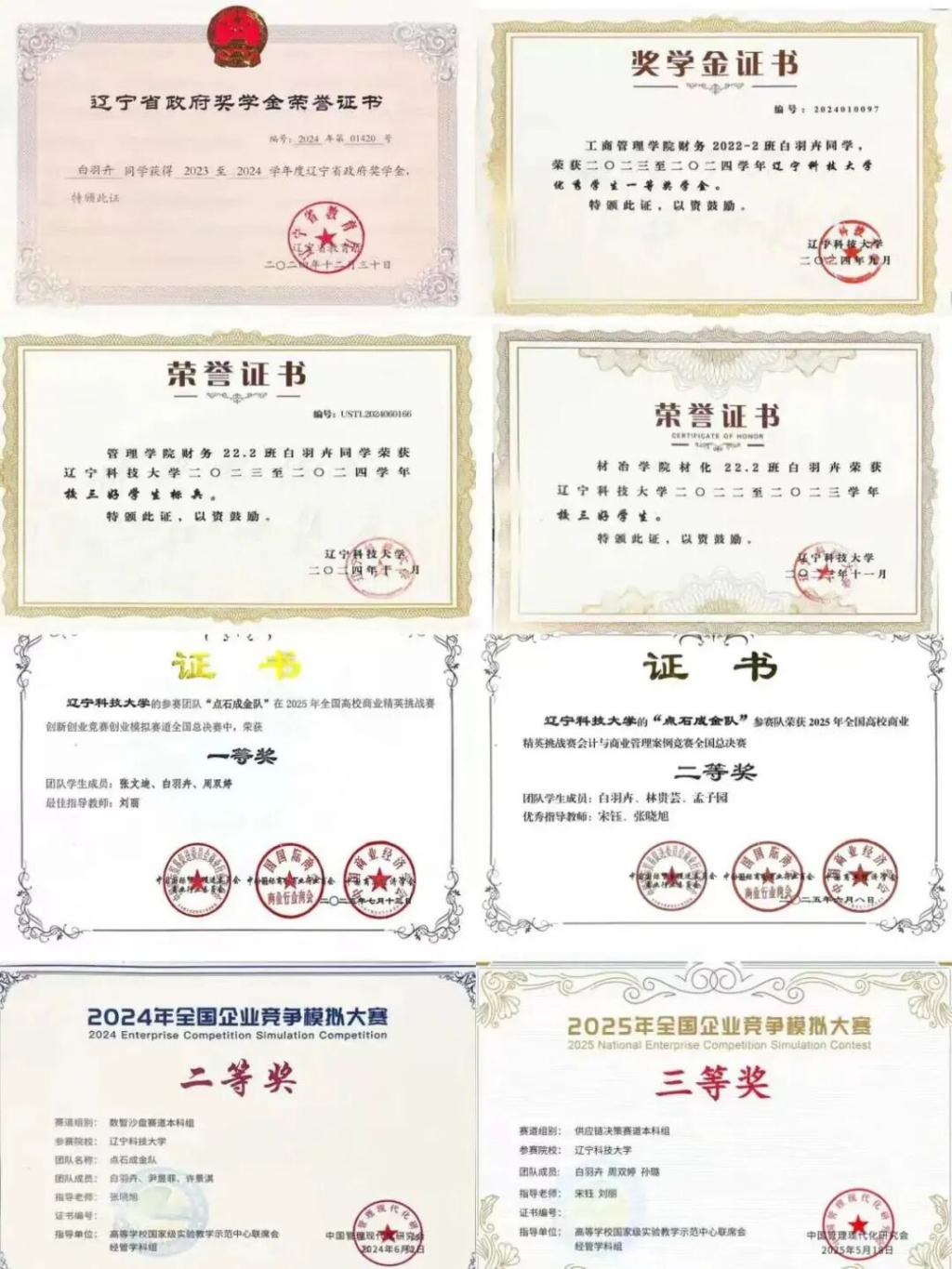 聚焦财务管理前沿议题,白羽卉以第一作者身份发表论文:《区块链技术在企业财务管理中的应用研究》《数字化时代背景下企业财务管理的转型升级路径》两篇论文被知网收录,分别发表于《今日财富》《中国商界》;《绩效评估在企业财务管理中的应用研究》《大数据视阈下企业财务管理的信息化建设研究》被万方数据库收录,刊登于《警戒线》《电脑校园》。此外,她还积极参与辽宁省教育厅课题“基于净零经济的辽宁工业企业精益绿色技术创新实现路径与对策研究”,将科研与区域发展需求紧密结合。 从国家级到省级竞赛,白羽卉始终是团队中的“核心力量”:国家级层面,7项荣誉涵盖多领域——2025年全国高校商业精英挑战赛创新创业竞赛创业模拟赛道全国一等奖、会计与商业管理案例竞赛全国二等奖、品牌策划竞赛全国二等奖,2024-2025年全国企业竞争模拟大赛数智沙盘赛道二等奖、供应链决策赛道三等奖等,多次助力团队夺冠;省级层面,斩获第三届辽宁省财务大数据分析大赛二等奖、辽宁省大学生商科综合能力大赛三等奖等3项奖项,用实力证明在商科领域的竞争力。