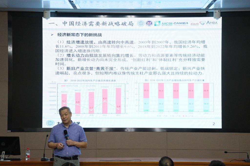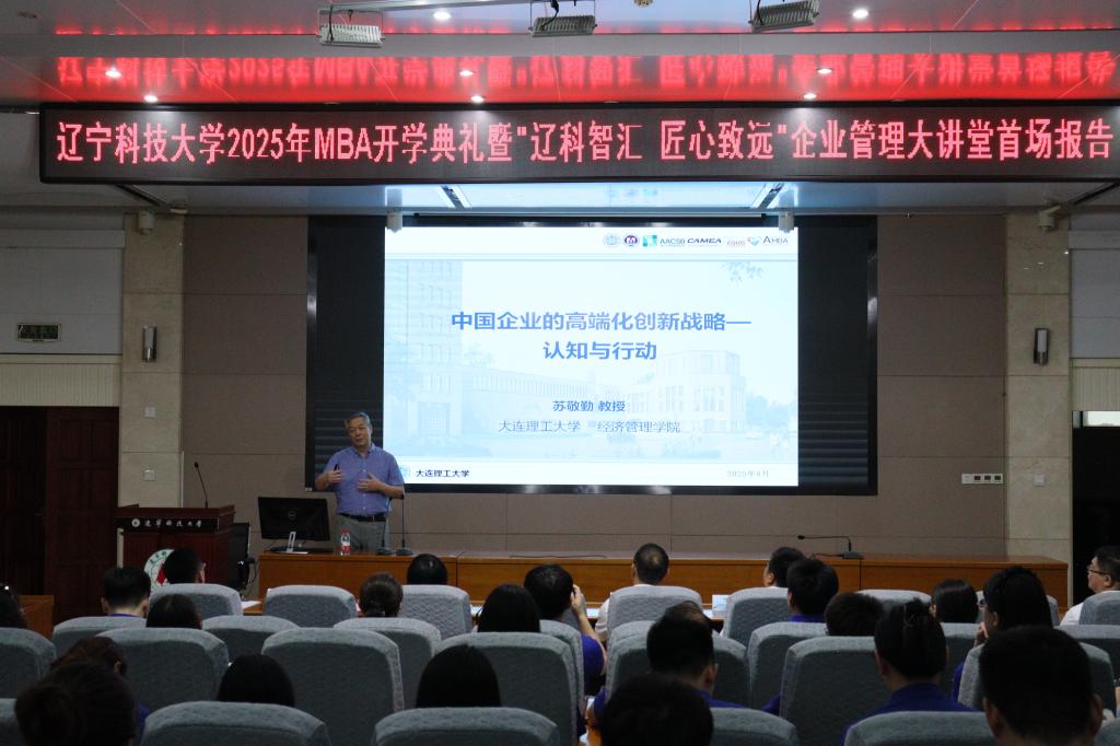 2025年8月30日,九游在线官网_九游(中国)工商管理学院迎来了一场思想盛宴——MBA2025级开学典礼暨“辽科智汇·匠心致远”企业管理大讲堂正式启动。首场报告特邀国家级领军人才、大连理工大学苏敬勤教授作题为《中国企业的高端化战略—从认知到行动》的专题演讲。讲座由工商管理学院院长金玉然教授主持,2025级全体MBA学员及部分教师参与本次论坛。