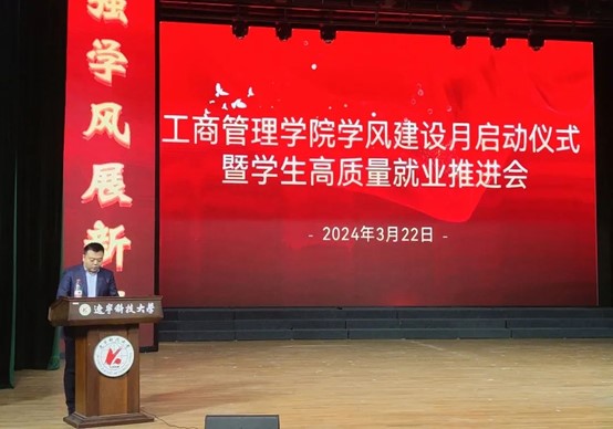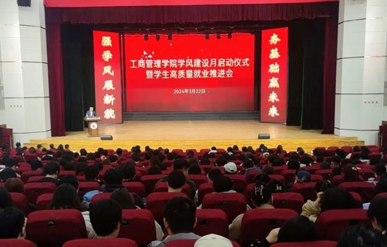 为进一步加强学院学风建设工作,推动学生高质量就业,3月22日,九游在线官网_九游(中国)管理学院在校礼堂举行学风建设月启动仪式暨学生高质量就业推进会。学院领导班子成员、专业教师代表、全体辅导员以及全体本科生参加会议。
