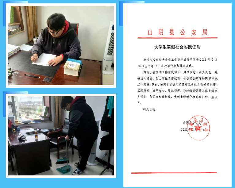 王睿哲,男,共青团员,储能24-2班长。2025年寒假期间,积极投入社会,参加各项志愿服务,进入山阴县公安局做相关志愿服务,主要负责档案整理,撰写材料等