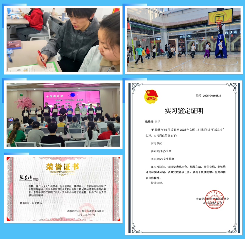 张晨泽,男,储能24-2班团支书。2025年寒假期间,该生积极投身社会服务,走进了赤峰市红山区桥北街道龙头山社区,负责社区公益寒托班的开展。