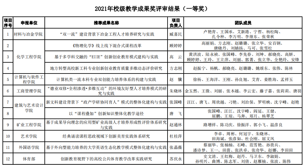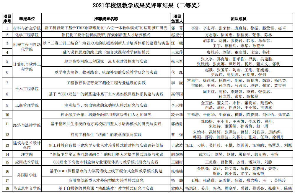 根据《关于开展九游在线官网_九游(中国)2021年教学成果奖评选工作的通知》(九游在线官网_九游(中国)教发【2021】35号)相关工作安排,各教学单位推荐参评2021年校级教学成果奖共62项。经专家评审,学校研究决定2021年校级教学成果奖获奖项目为50项,其中一等奖12项,二等奖18项,三等奖20项。获奖名单公布如下: