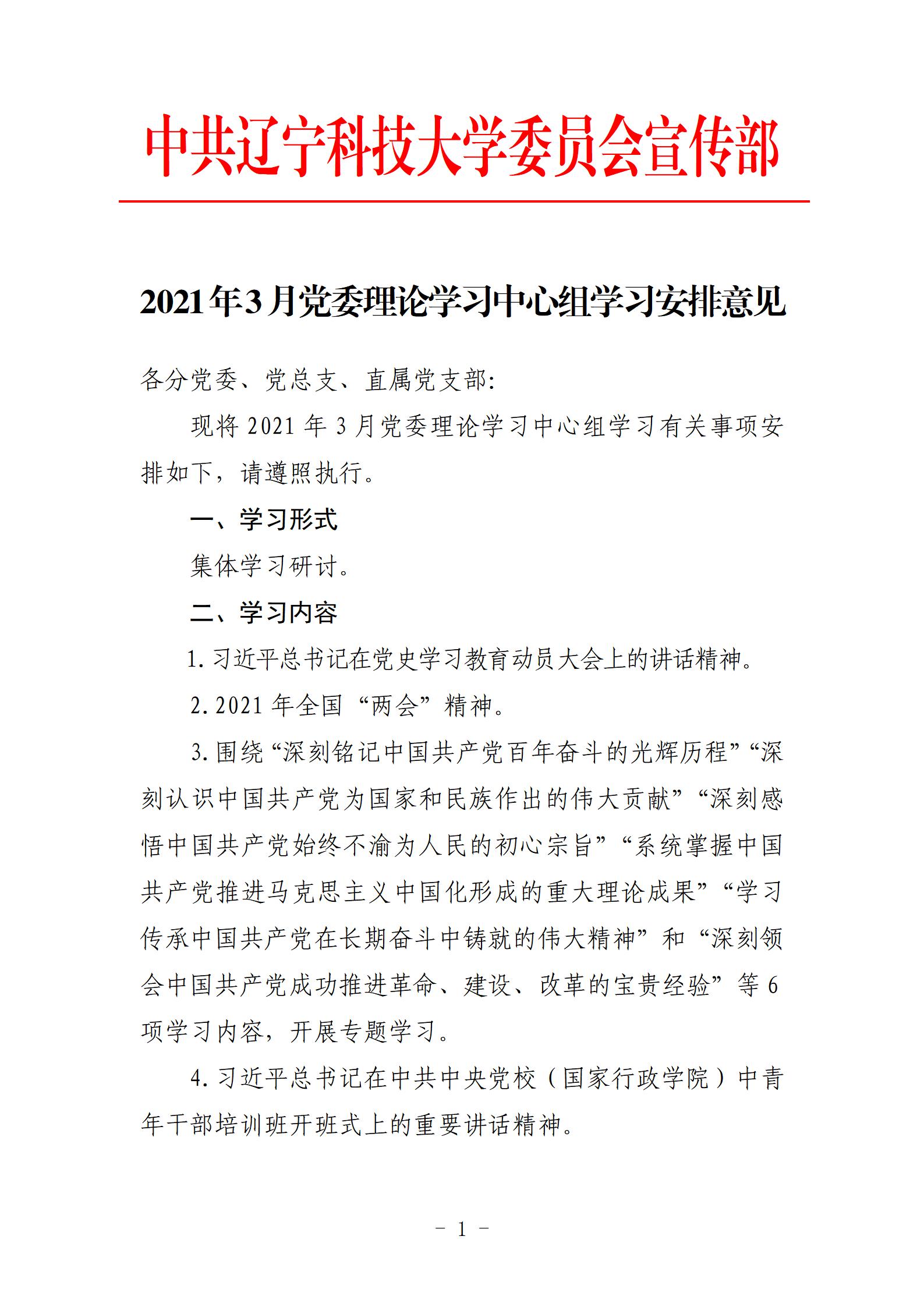 2021年3月党委理论学习中心组学习安排意见