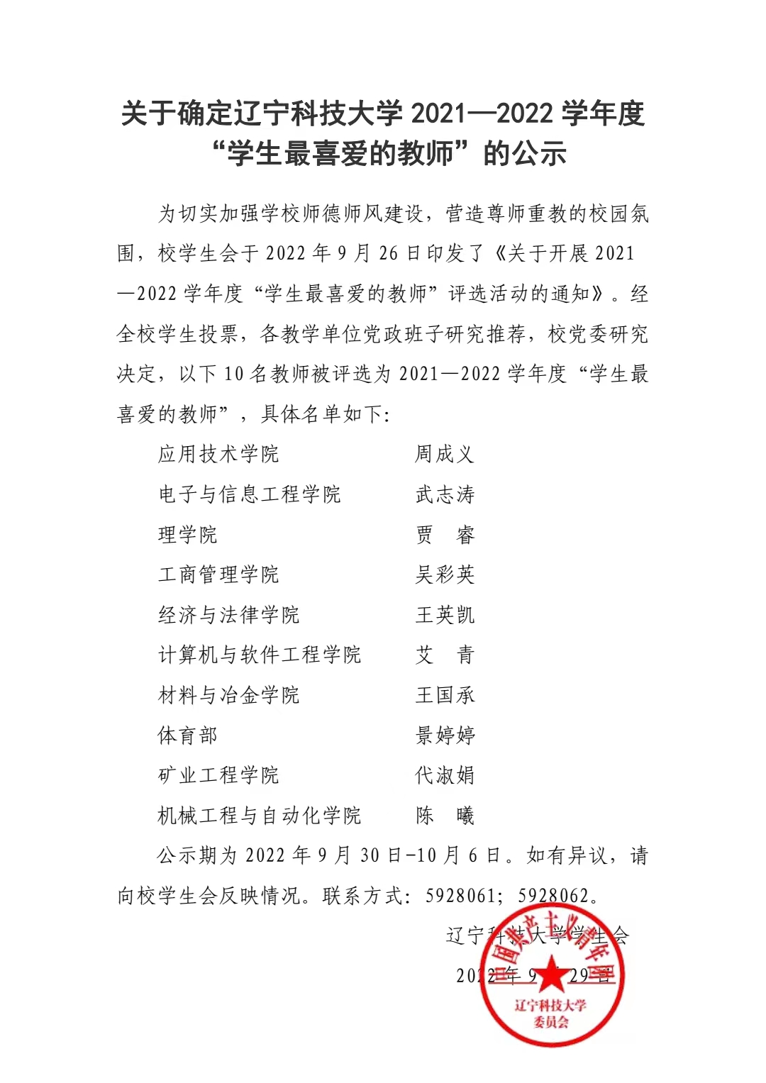 关于确定九游在线官网_九游(中国) 2021—2022 学年度 “学生最喜爱的教师”的公示