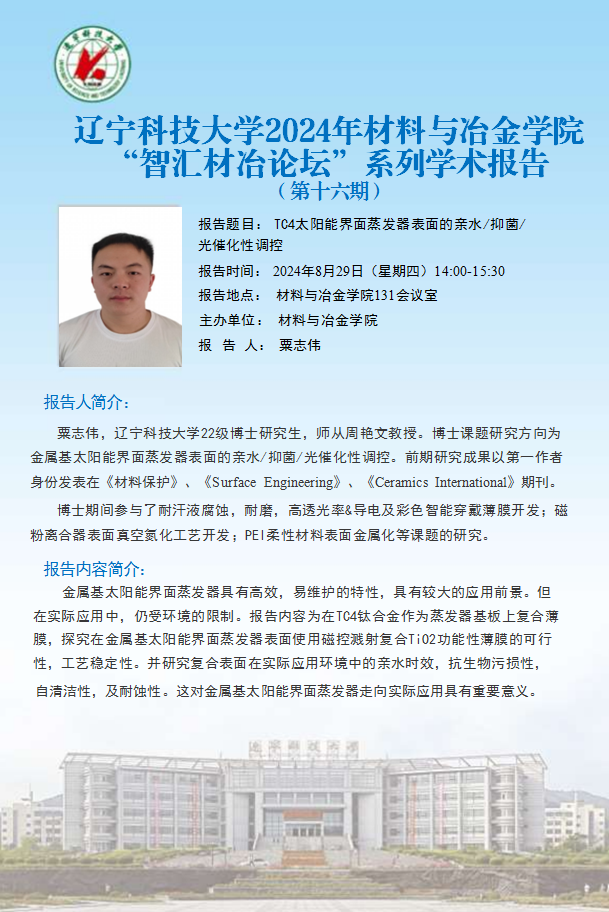 学术预告:TC4太阳能界面蒸发器表面的亲水/抑菌/光催化性调控