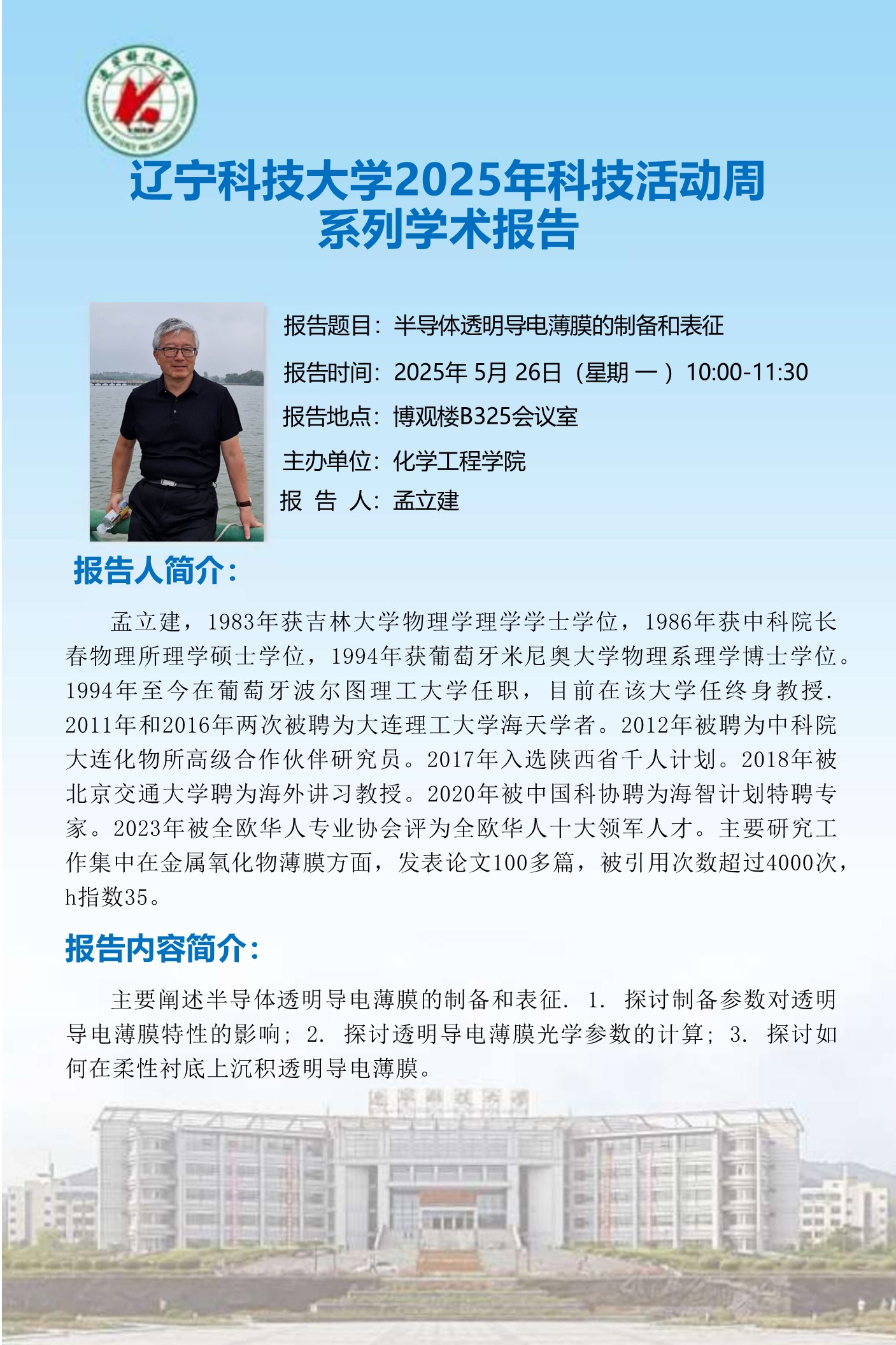 【科技活动周学术预告】半导体透明导电薄膜的制备和表征