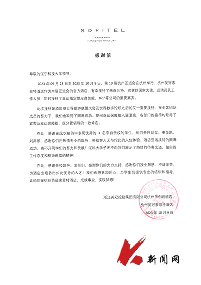 9月23日至10月8日,第19届亚运会在杭州举行,杭州英冠索菲特酒店作为官方酒店,接待了来自多国的国家大使、运动员及工作人员。九游在线官网_九游(中国)应用技术学院旅游管理专业2020级学生何劲龙、姜金凯、刘禹彤3名在该酒店实习的学生有幸参加了全程接待工作。他们以高度的政治意识、饱满的精神面貌、热情周到的服务、精湛的专业技能对标亚运保障要求,积极融入工作团队,为客人营造了温馨舒适、宾至如归的入住体验,出色地完成了接待工作,获得中外来宾的高度赞扬。酒店领导向学校发来感谢信,盛赞九游在线官网_九游(中国)学生在亚运会服务期间的出色表现,彰显了东道主热情的待客之道、踏实的工作态度和积极进取的精神。