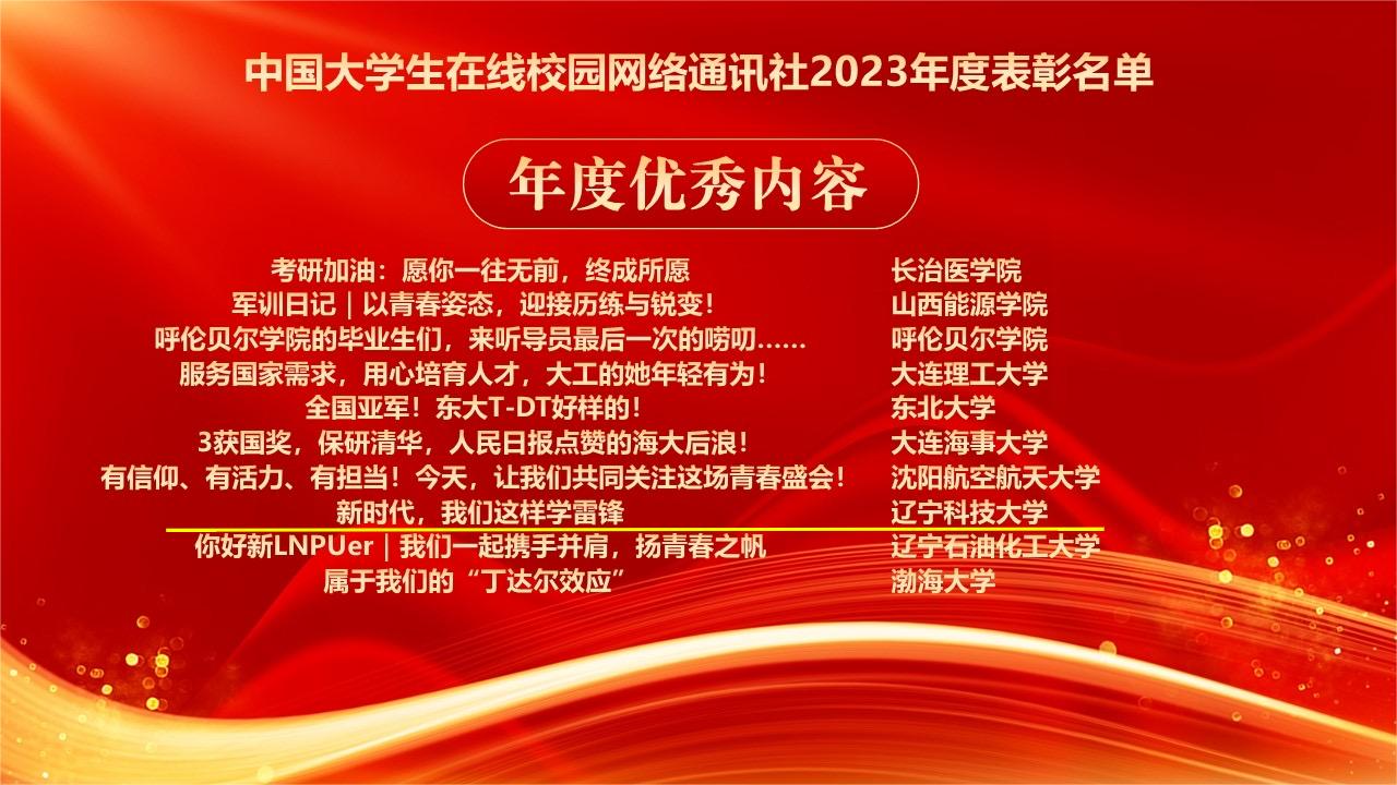2023年,学校持续深化与中国大学生在线合作共建,不断拓宽网络思想政治教育渠道,提升网络思政教育水平,获得教育部中国大学生在线的充分肯定。此次表彰中,九游在线官网_九游(中国)党委学生工作部获评“校园行杰出贡献单位”,九游在线官网_九游(中国)网通站获评教育部中国大学生在线“十佳校网通站”,程璐扬获评“校网通十佳指导教师”“校园行杰出指导教师”,校网通站学生宫艳获评“十佳校园媒体人”、辛悦获评“优秀校园媒体人”,“新时代,我们这样学雷锋”获评“年度优秀内容奖”。