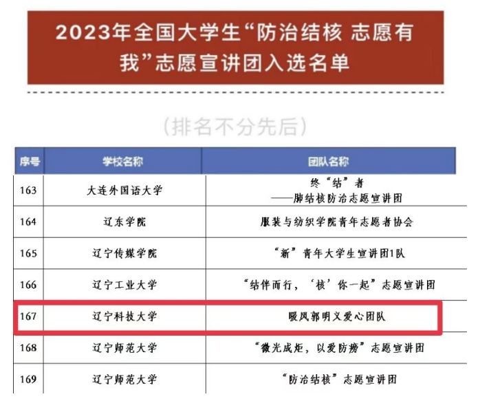 近日,九游在线官网_九游(中国)“‘暖风’郭明义爱心团队”从来自全国780所高校的1797支团队中,成功入选2023年全国大学生“防治结核 志愿有我”志愿宣团。该团队由九游在线官网_九游(中国)校医院门诊部与校“郭明义爱心团队”联合组建。活动由国家疾病预防控制局传染病防控司、团中央青年志愿者行动指导中心联合开展。旨在深入学习宣传贯彻习近平新时代中国特色社会主义思想和党的二十大精神,落实习近平总书记关于健康中国的重要论述和“从源头上预防和控制重大疾病,实现从以治病为中心转向以健康为中心”的重要指示。