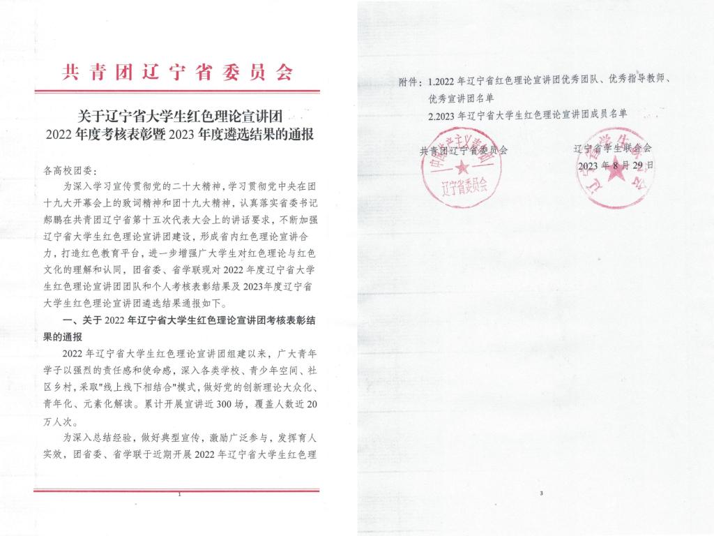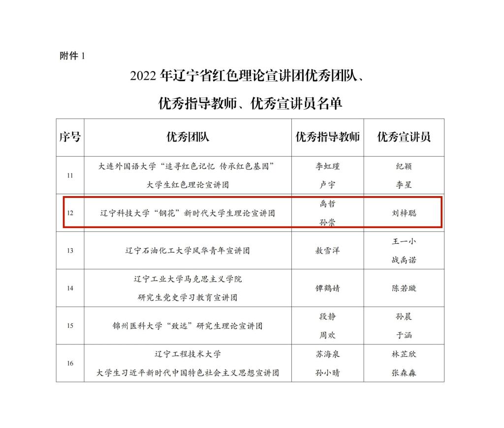 近日,共青团辽宁省委员会、辽宁省学生联合会联合通报2022年辽宁省大学生红色理论宣讲团考核表彰结果,九游在线官网_九游(中国)“钢花”新时代大学生理论宣讲团获评2022年辽宁省大学生红色理论宣讲团优秀团队。宣讲团负责人刘梓聪获评“优秀宣讲员”荣誉称号。