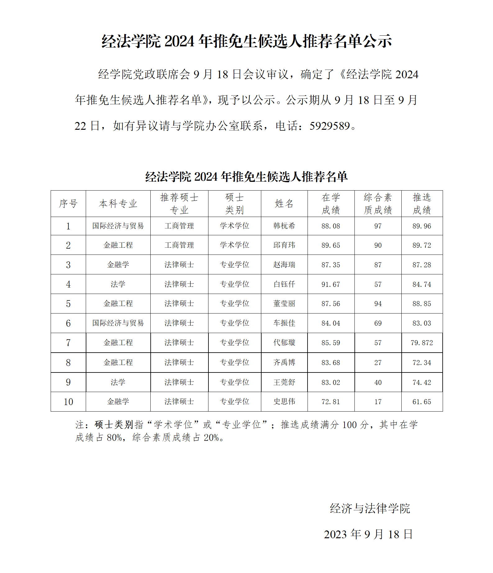 经法学院2024年推免生候选人推荐名单公示