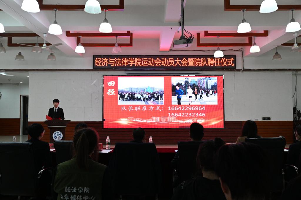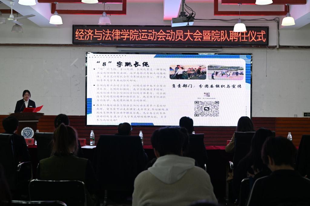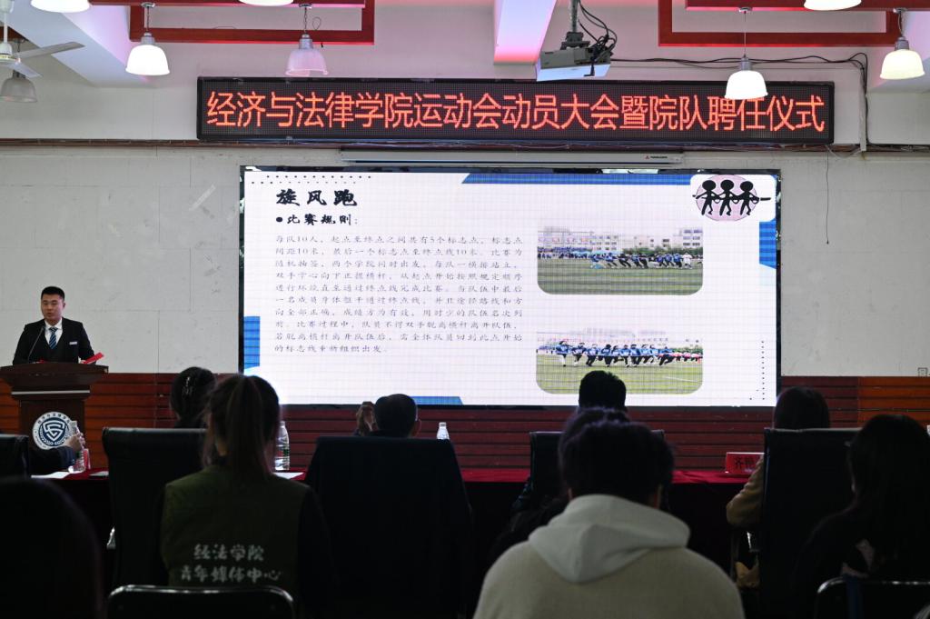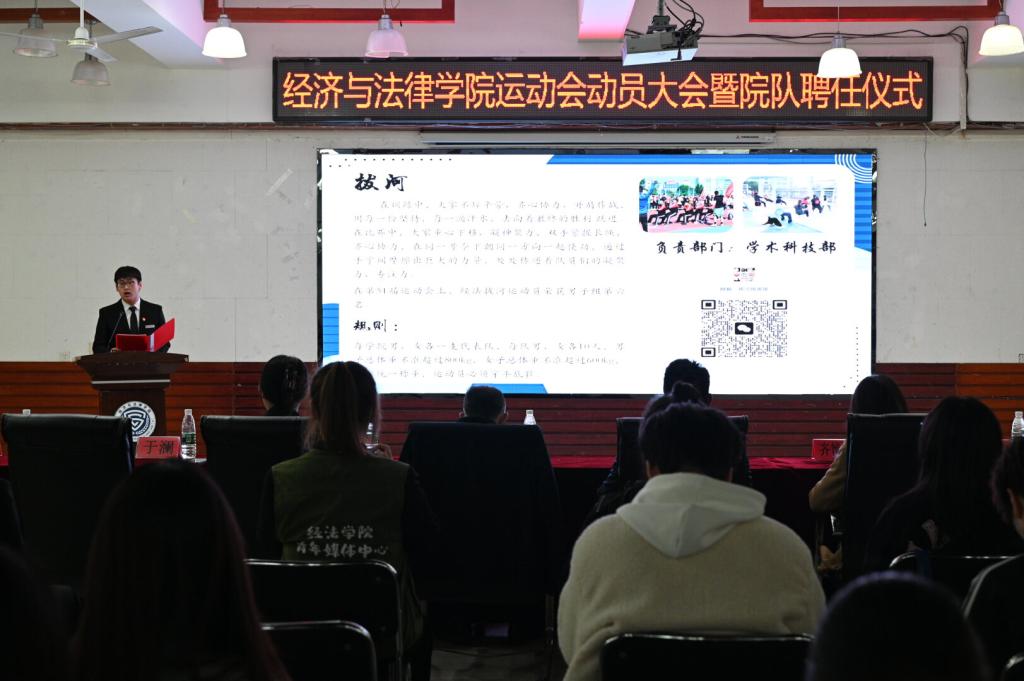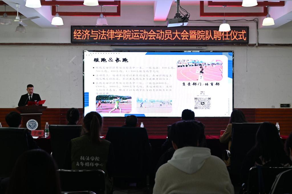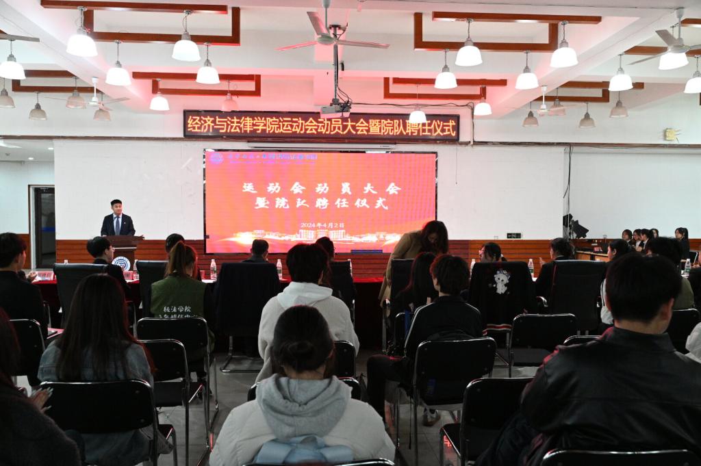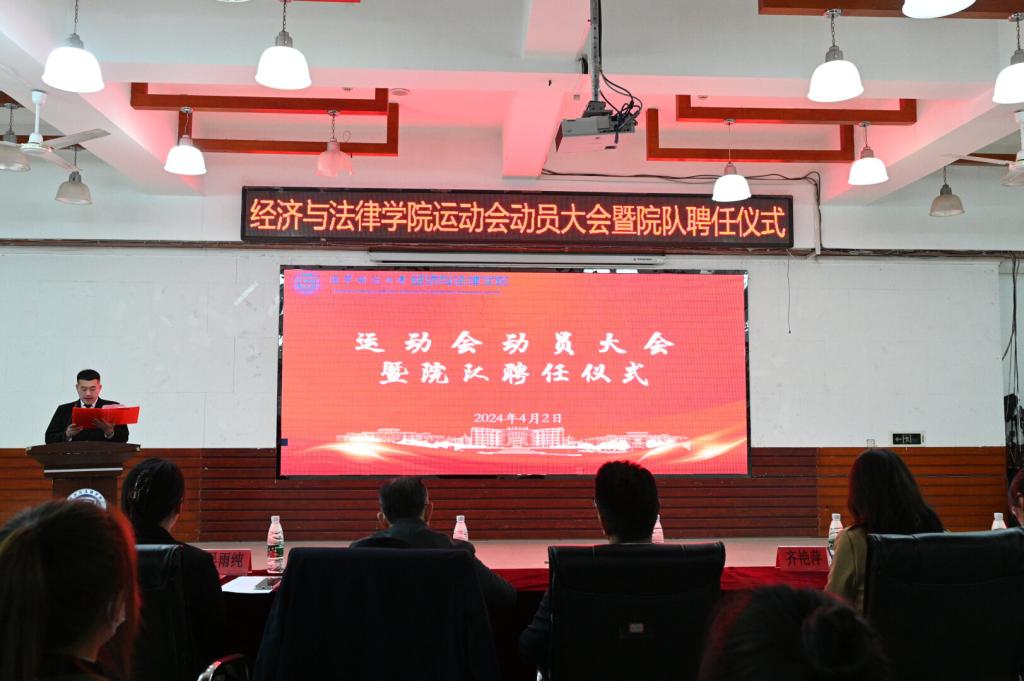 4月2日,经法学院于明德楼大学生活动中心召开运动会动员大会暨院队聘任仪式。本次大会由经法学院团委副书记张鹏飞主持,学院党委书记赵智博、党委副书记张国华、学办主任齐艳萍出席会议,学院各院队正、副队长、全体团学骨干以及2023级全体学生共计300余人参加会议。