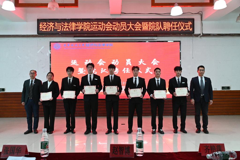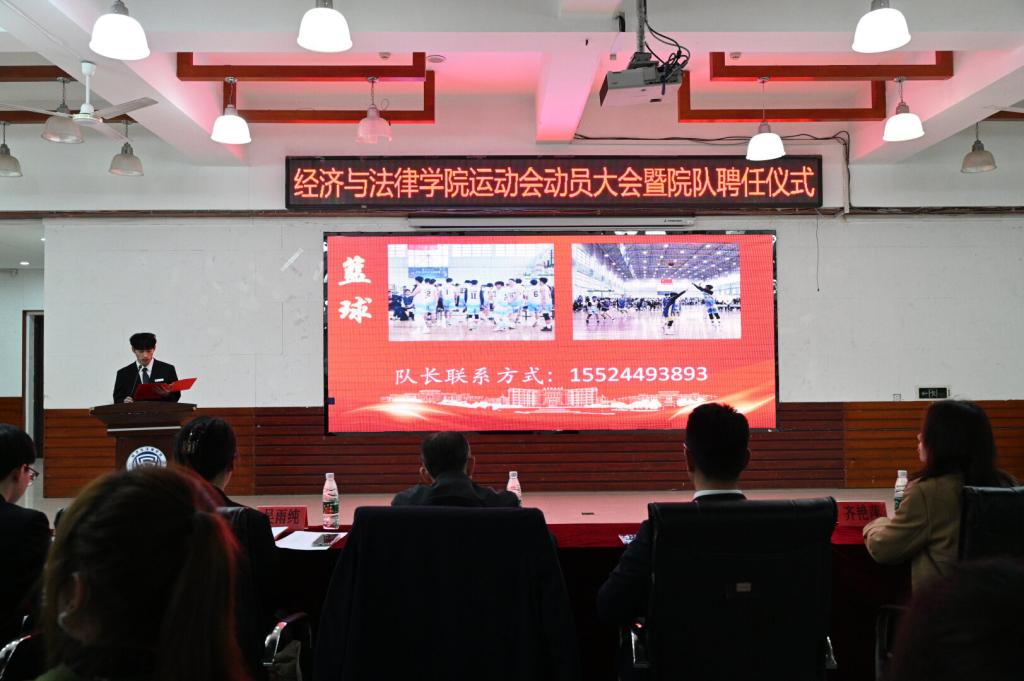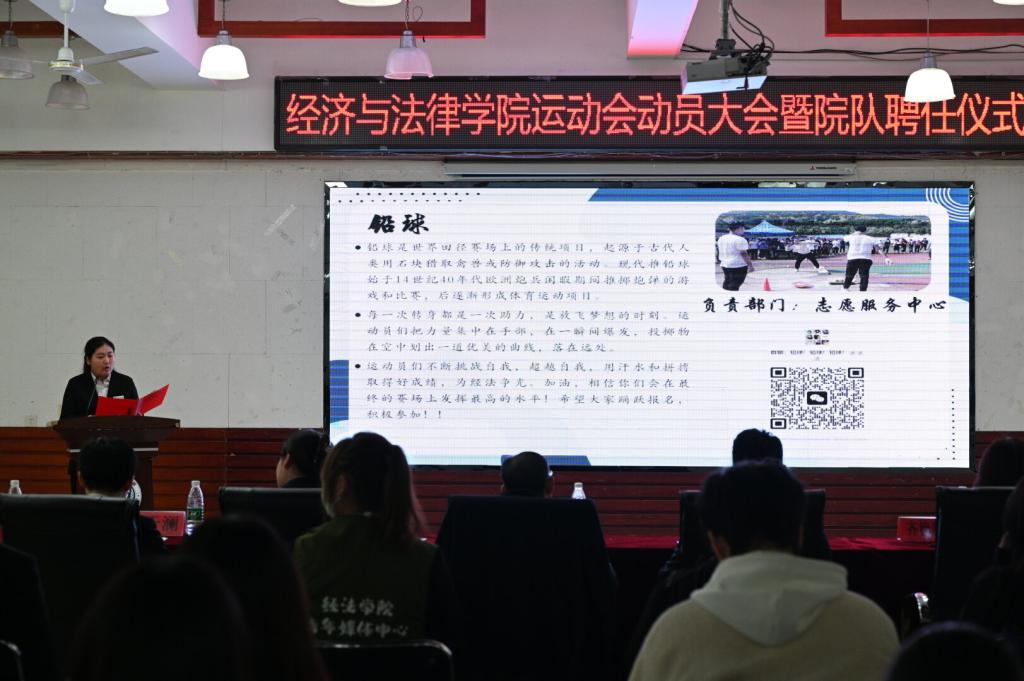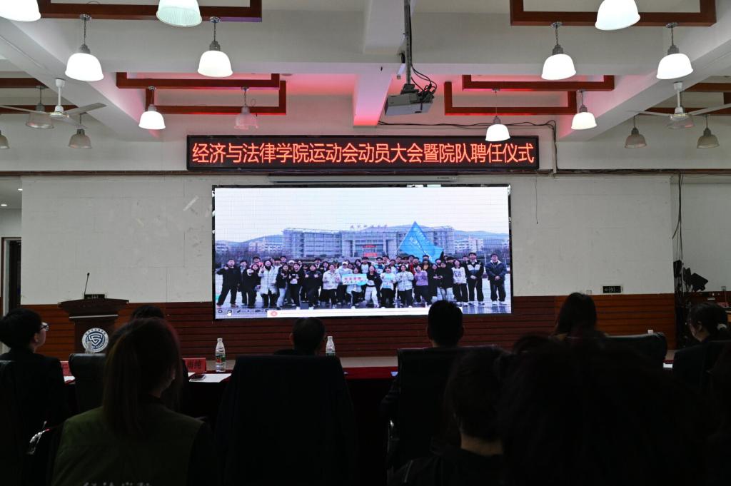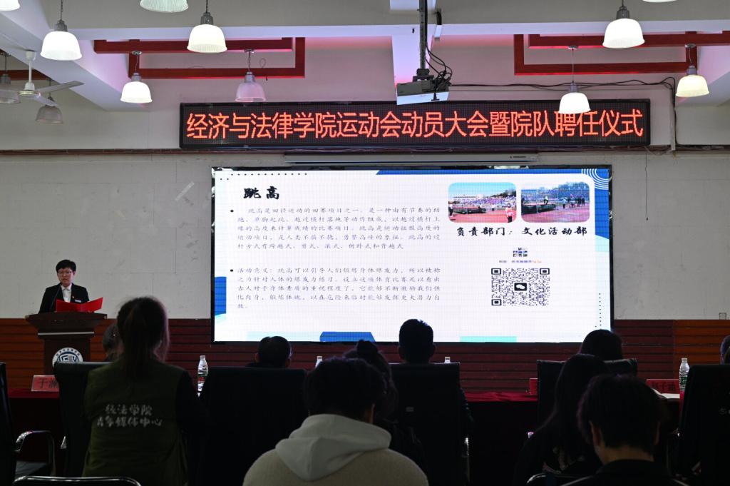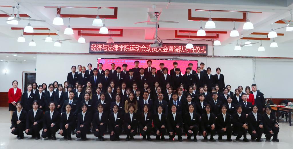 4月2日,经法学院于明德楼大学生活动中心召开运动会动员大会暨院队聘任仪式。本次大会由经法学院团委副书记张鹏飞主持,学院党委书记赵智博、党委副书记张国华、学办主任齐艳萍出席会议,学院各院队正、副队长、全体团学骨干以及2023级全体学生共计300余人参加会议。