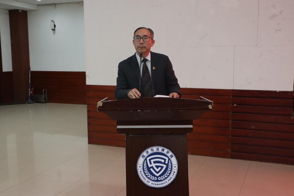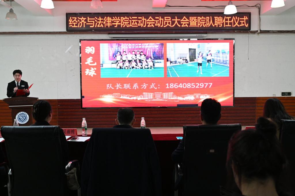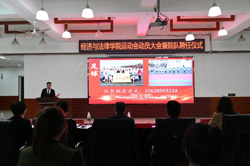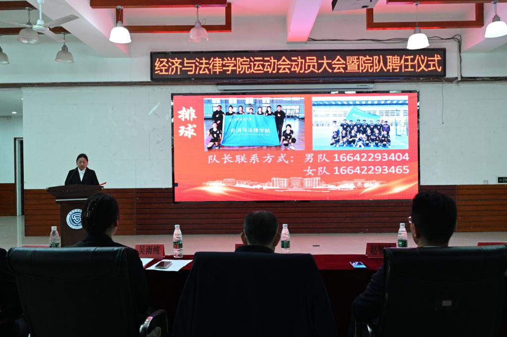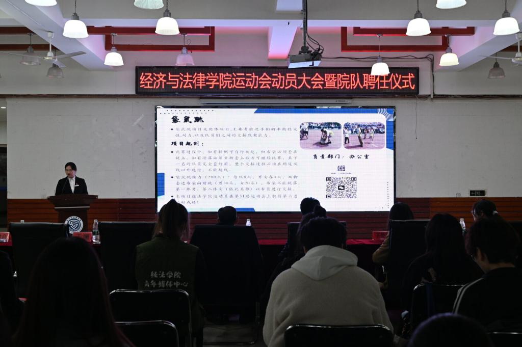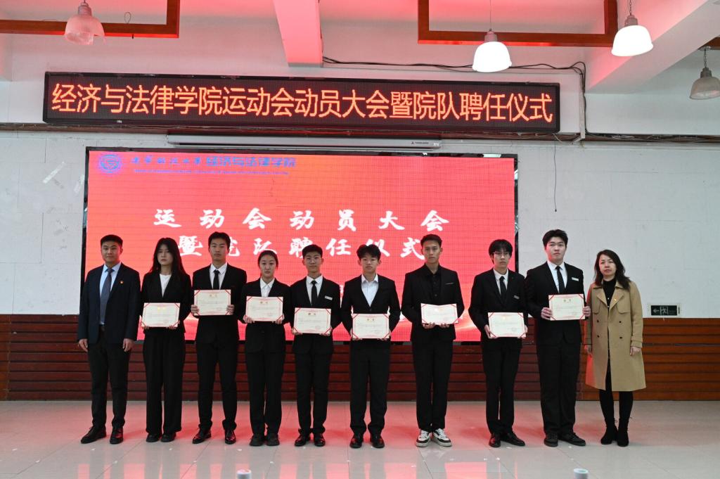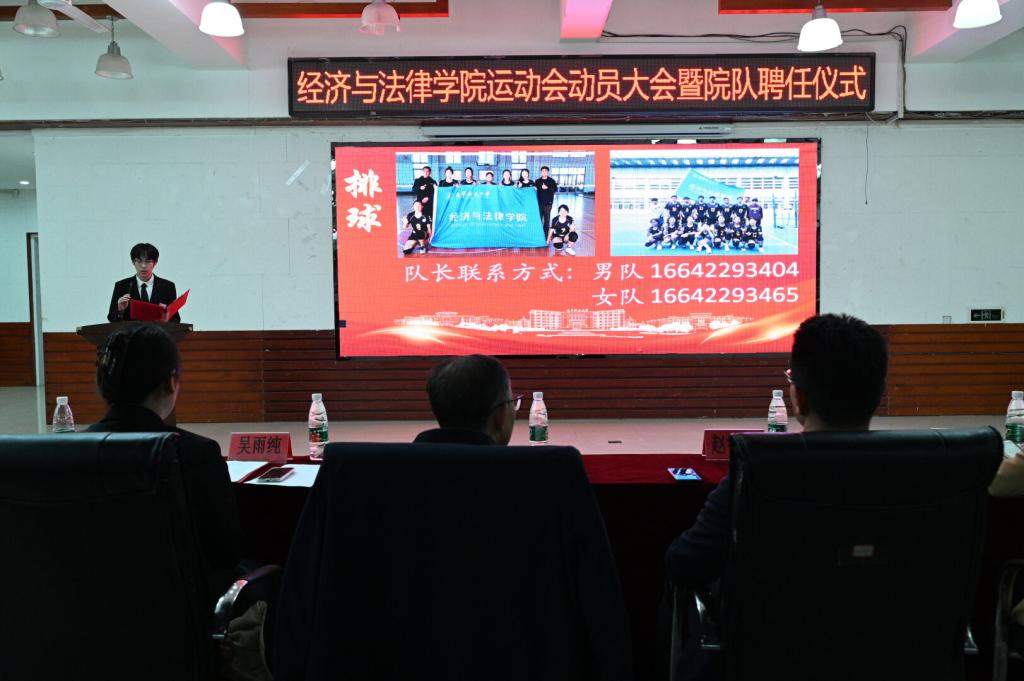 4月2日,经法学院于明德楼大学生活动中心召开运动会动员大会暨院队聘任仪式。本次大会由经法学院团委副书记张鹏飞主持,学院党委书记赵智博、党委副书记张国华、学办主任齐艳萍出席会议,学院各院队正、副队长、全体团学骨干以及2023级全体学生共计300余人参加会议。