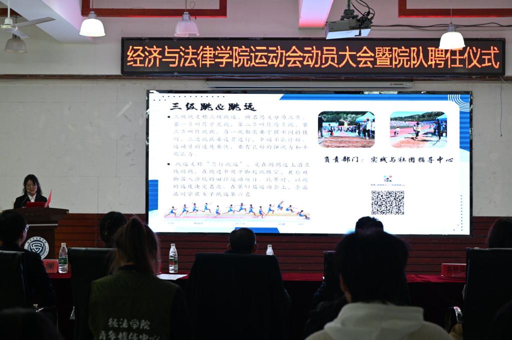 张鹏飞带领全体与会人员共同观看了经法学院在第五十一届校运动会中精彩表现的视频影像,回顾了经法运动员激情昂扬、英姿飒爽的运动风采,共同感受了经法学子奋力拼搏、永不言败的运动精神,激发了同学们的运动激情。金融科技23-1班刘世涛作为运动员代表发言。他表示,经法学院全体运动员们在今后的训练中定会团结一心,不抛弃、不放弃;在比赛中遵守规则、尊重对手、尊重裁判,以公平、公正的态度参与竞争,全力拼搏,争取不负众望、再创佳绩。随后,学院各训练项目负责人向大家介绍各项目的竞赛规则、运动技巧和注意事项,并通过现场演示生动地展现了各个项目的动作要领,现场气氛热烈,极大地激发了同学们的参与热情。