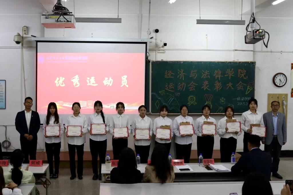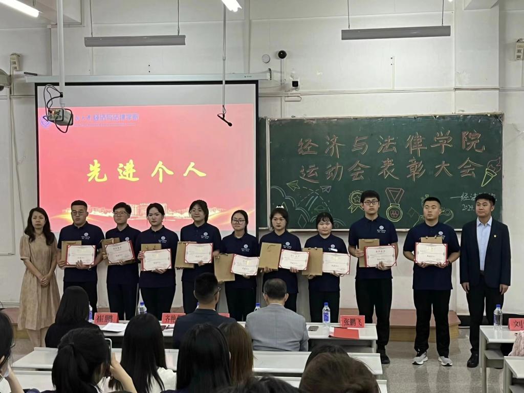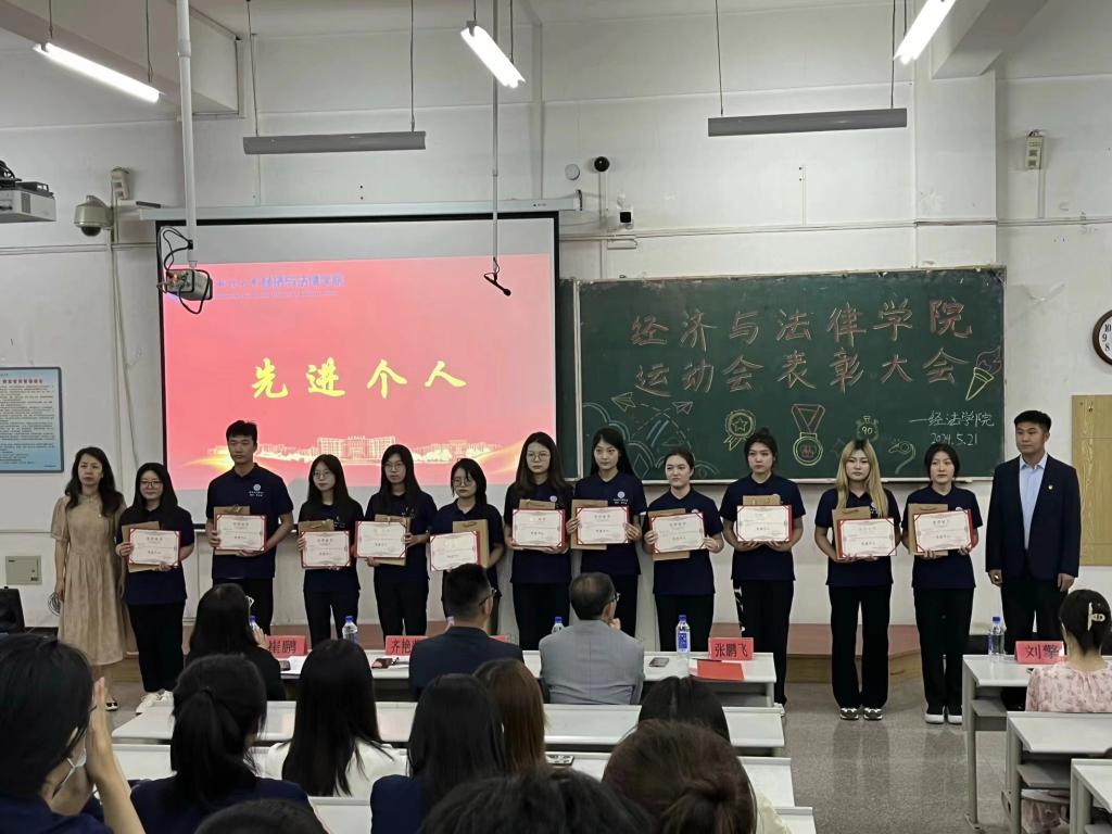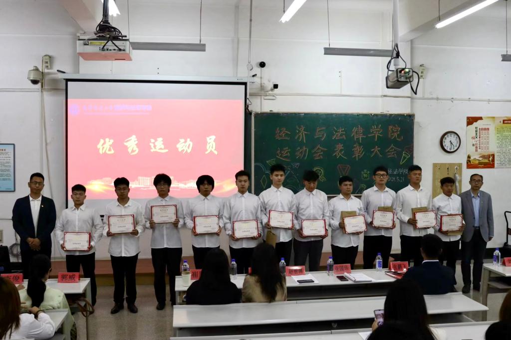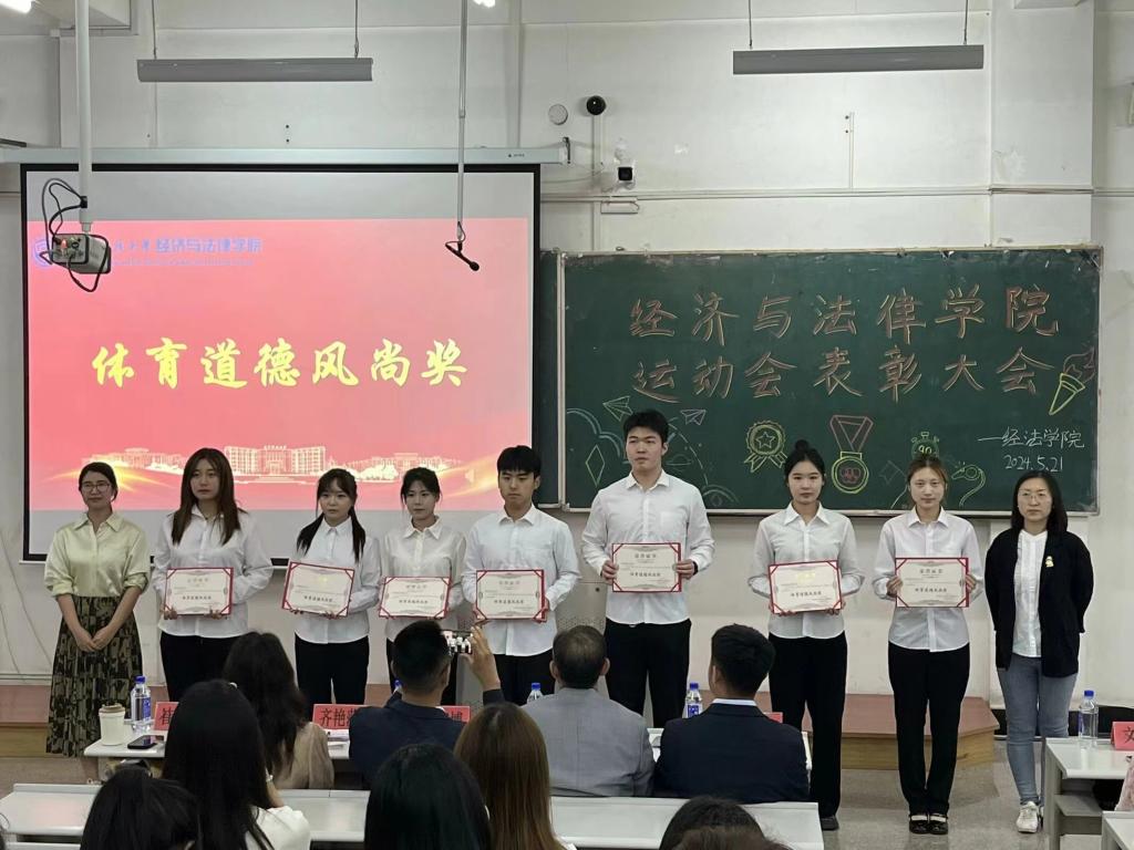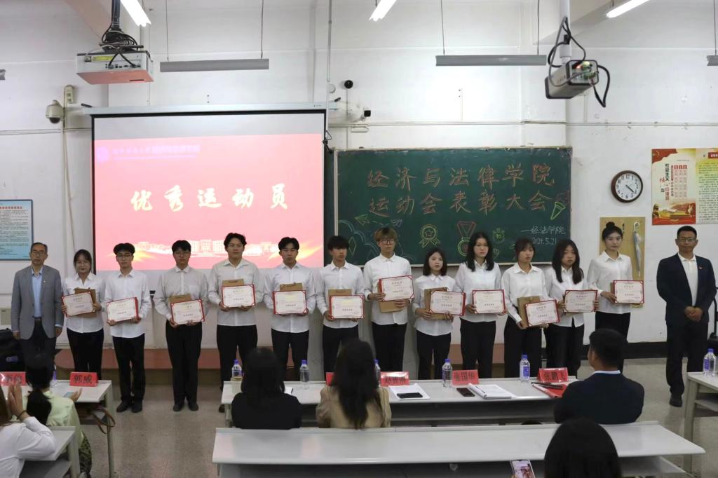 5月21日晚,经法学院于博学楼C102召开第五十二届运动会表彰大会。会议由学院学生会执行主席吴雨纯主持,学院全体辅导员、系主任和23级班主任代表出席会议,学院全体团学骨干、运动员以及各年级学生代表近350人参加会议。
