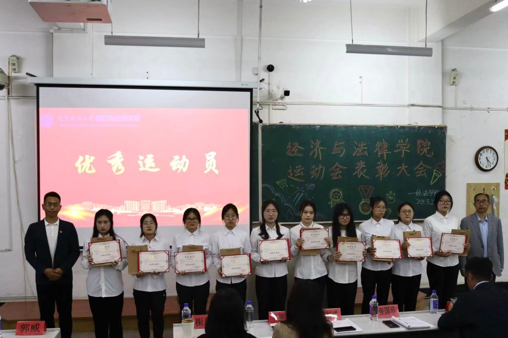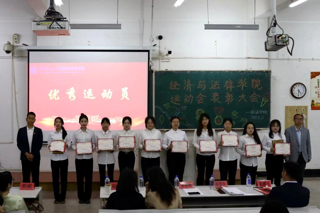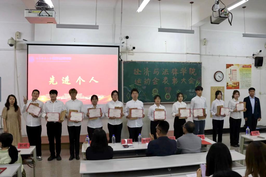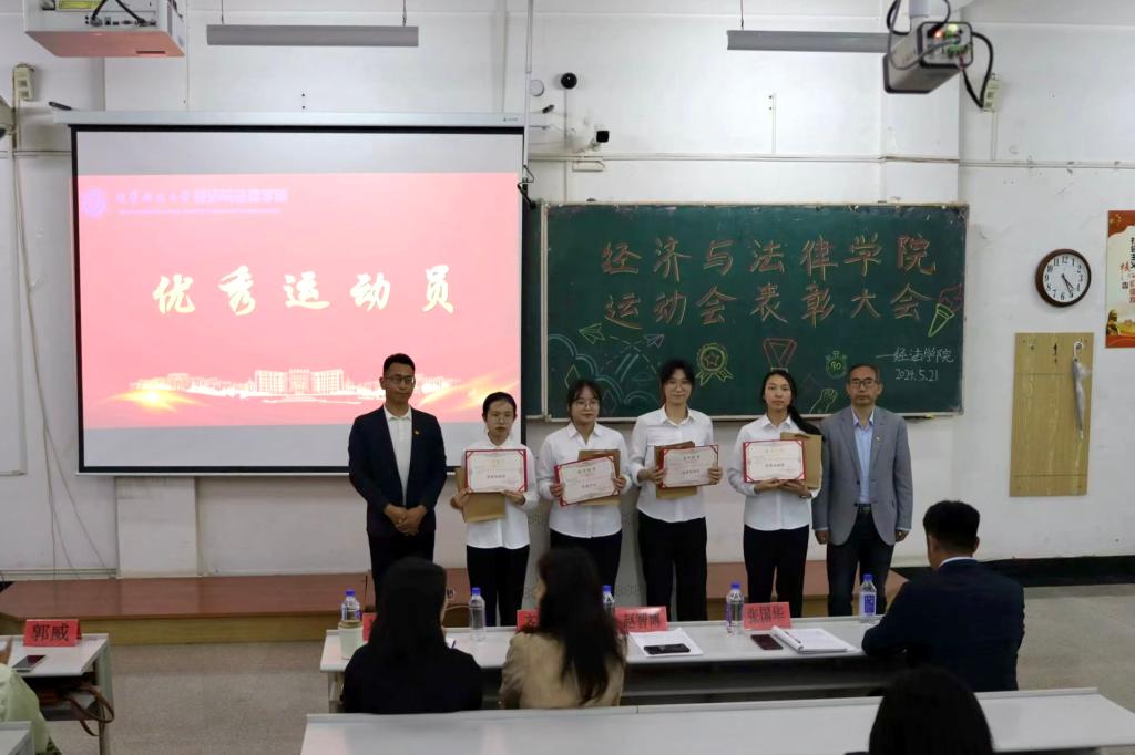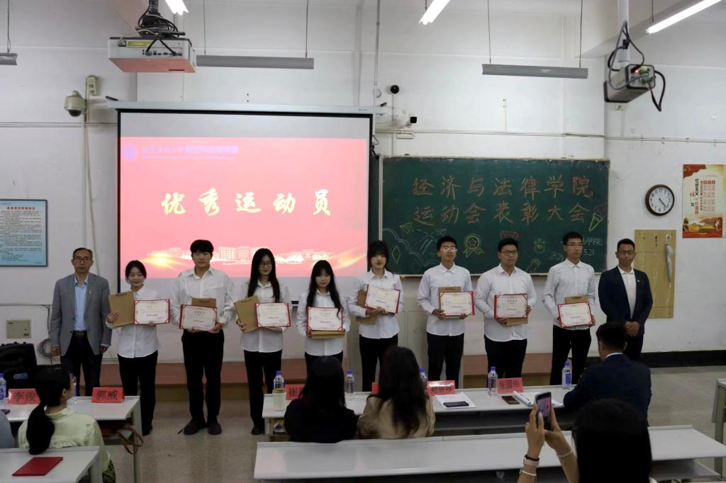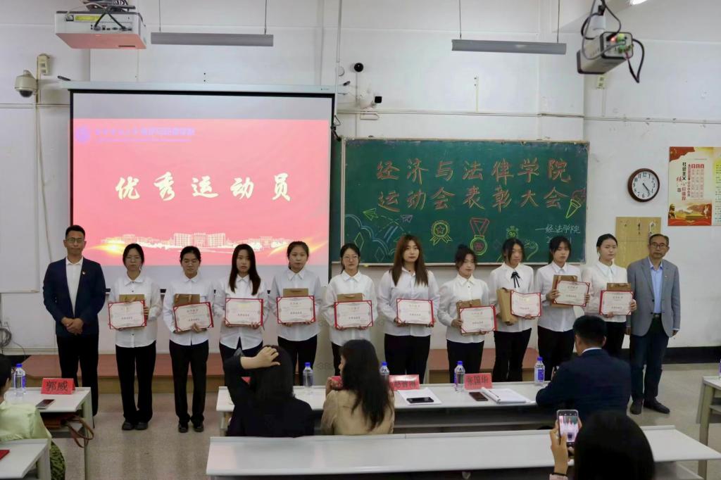 5月21日晚,经法学院于博学楼C102召开第五十二届运动会表彰大会。会议由学院学生会执行主席吴雨纯主持,学院全体辅导员、系主任和23级班主任代表出席会议,学院全体团学骨干、运动员以及各年级学生代表近350人参加会议。