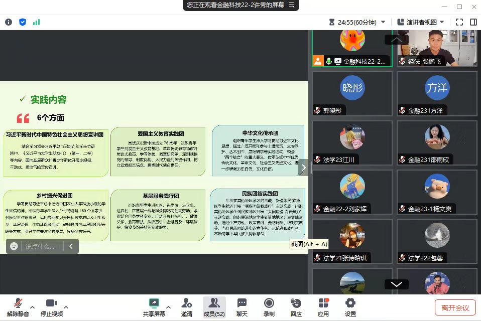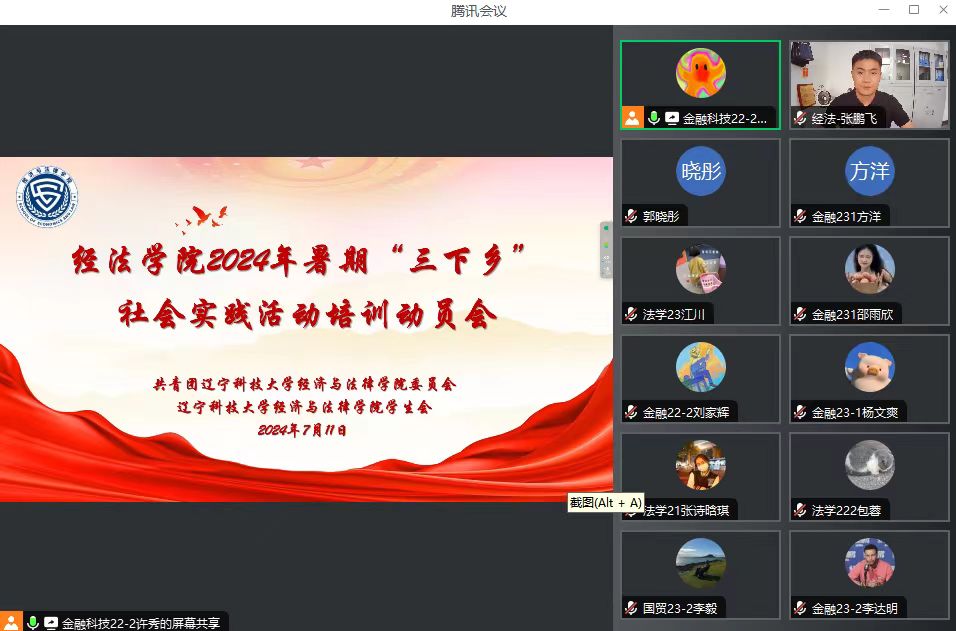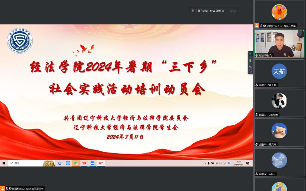 7月11日,经法学院于腾讯会议APP召开暑期“三下乡”社会实践活动培训动员会,会议由学院分团委实践与社团指导中心工作人员许秀主持,学院党委书记赵智博、团委副书记张鹏飞、分团委副书记兼实践与社团指导中心负责人张诗晗琪以及各支实践团队成员共计50余人参加会议。