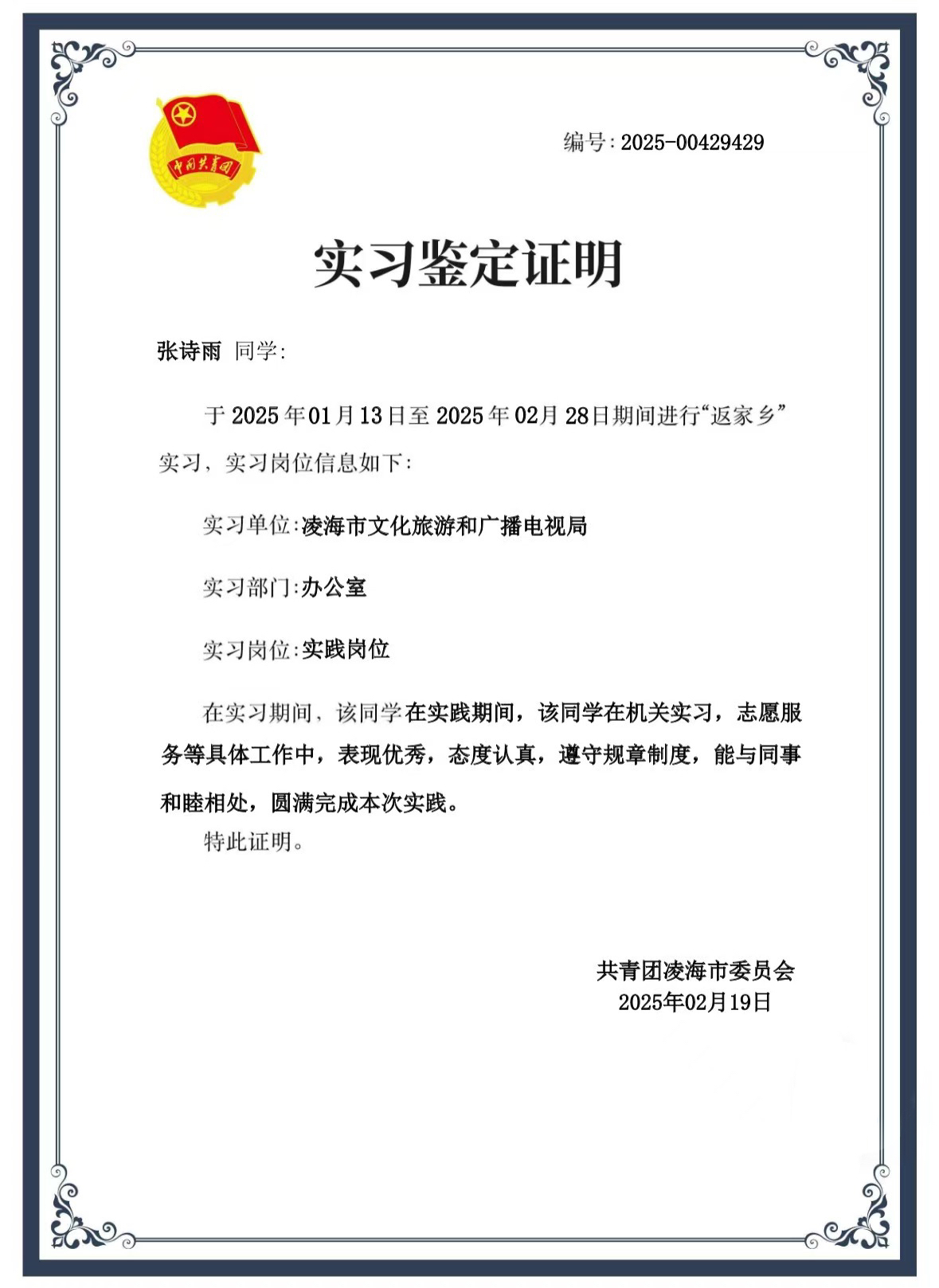 张诗雨,女,共青团员,金融22-1班学生,现任班级宣传委员。寒假期间该生积极投身“返家乡”社会实践活动,在凌海市文旅局开展为期一个月的志愿服务。
