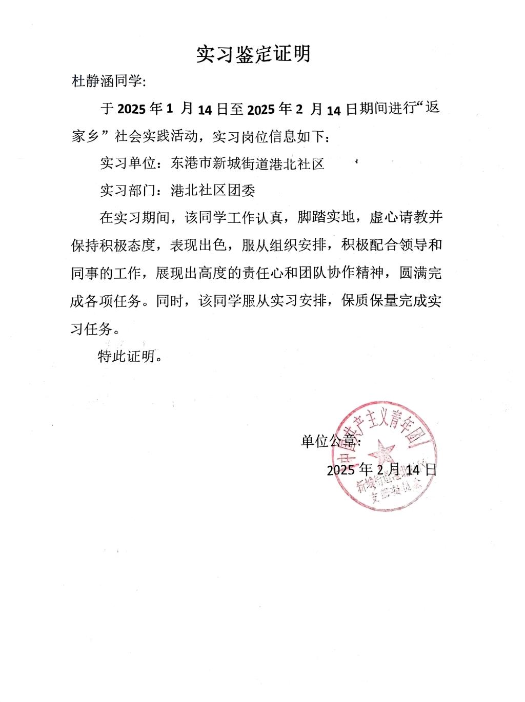 杜静涵,女,共青团员,国贸24-1班学生,现任班级宣传委员。寒假期间她积极响应“返家乡”社会实践号召,在港北社区团委开展志愿服务。