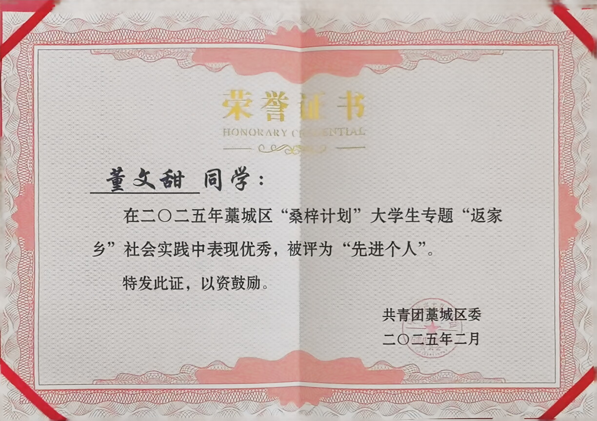 董文甜,女,共青团员,金融科技22-1班学生。寒假期间她积极投身家乡“桑梓计划”大学生专题“返家乡”社会实践,在南董镇人民政府进行了为期一个月的志愿服务。