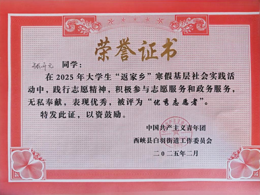 张开元,男,共青团员,金融科技24-2班学生。寒假期间他积极投身西峡县“返家乡”社会实践活动,在西峡县白羽刘巷社区开展了丰富且充实的志愿服务。