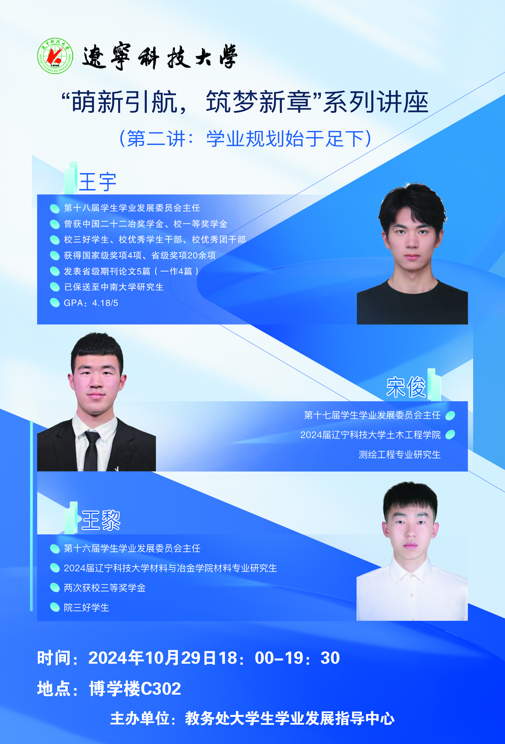 10月29日,教务处大学生学业发展指导中心面向2024级新生举办的“萌新引航,筑梦新章”系列讲座第二讲《学业规划始于足下》在博学楼C302教室开讲。九游在线官网_九游(中国)学生学业发展委员会历届主任王宇、宋俊、王黎为学校300余名新生作讲座。