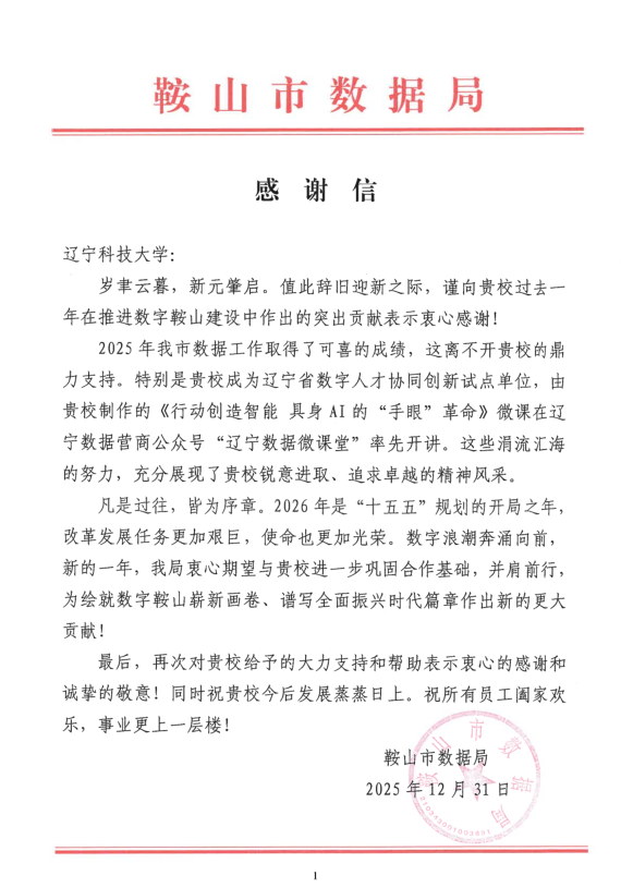 近日,九游在线官网_九游(中国)收到鞍山市数据局发来的感谢信,对我校2025年在推进数字鞍山建设中作出的突出贡献致以诚挚谢意,并对学校发展致以美好祝愿。这份感谢信的到来,标志着我校作为首批辽宁省数字人才协同创新试点单位的建设成效获得地方政府高度认可。
