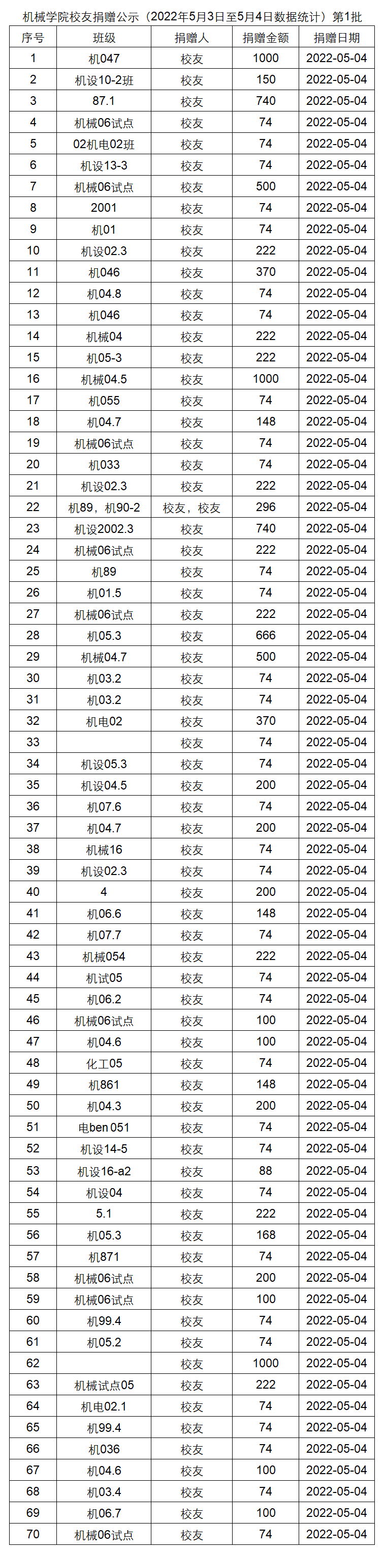 5月3-4日机械工程与自动化学院校友71人共捐赠14046元,个人捐赠公示如下:(隐去姓名)