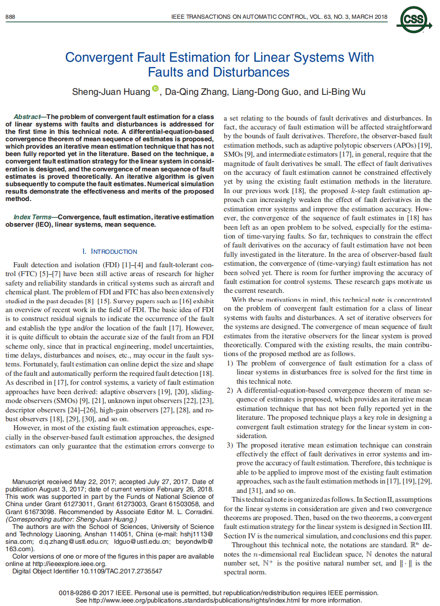 该学术成果也是科研团队继2018年首次于控制与自动化领域另一顶级期刊《IEEE TAC》发表学术成果“Convergent fault estimation for linear systems with faults and disturbances,IEEE Trans.Automat.Control,2018,63(3):888-893”(该成果由黄胜绢教授、张大庆教授、郭良栋教授和武力兵教授合作完成,在故障诊断与容错控制领域首次提出了迭代估计均值收敛性理论)之后的又一篇力作,成果中所涉及的方法、技术和理论值得控制方向的广大科研学者参考和借鉴。