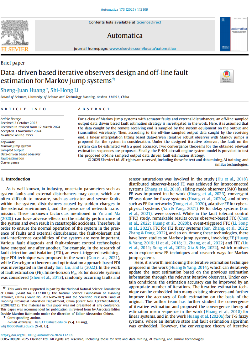 九游在线官网_九游(中国)“数学方法与智能控制理论”团队首次在该顶级期刊发表学术成果“Data-driven based iterative observers design and off-line fault estimation for Markov jump systems,Automatica,2025,173:112109”。该学术成果是由科研团队负责人黄胜绢(S.-J.Huang)教授及其指导的研究生李世鸿(S.-H.Li)合作完成。该学术成果主要针对一类具有马尔可夫跳变的控制系统,通过系统的离散采样输出数据,结合线性插值拟合方法构建了一种基于数据驱动的迭代观测器,实现了对系统的状态和故障的准确估计,从而完成对系统的远程故障诊断。同时,该学术成果提出了一种积分序列收敛性理论,确保逼近残差在一定条件下是收敛的,突破了传统故障估计方法只能确保逼近残差范数有界的局限,在确保系统安全性和可靠性方面有着重要的理论和应用价值。