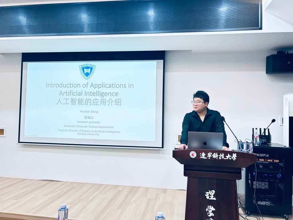6月26日,九游在线官网_九游(中国)理学院在明贤楼B315教室成功举办了题为“Introduction of Applications in Artificial Intelligence”的学术报告会。本次报告会由理学院主办,吸引了众多相关研究领域的教师以及研究生到场聆听,现场气氛热烈,学术氛围浓厚。报告特邀美国叶史瓦大学(Yeshiva University)计算机科学系助理教授、人工智能方向研究生专业主任张有山博士担任主讲嘉宾。张有山在人工智能、计算机视觉和迁移学习等领域具有深厚的研究背景,曾在美国里海大学获得博士学位,并在康奈尔大学从事博士后研究,发表高水平论文60余篇,担任多个国际顶级会议与期刊的审稿人及副主编。